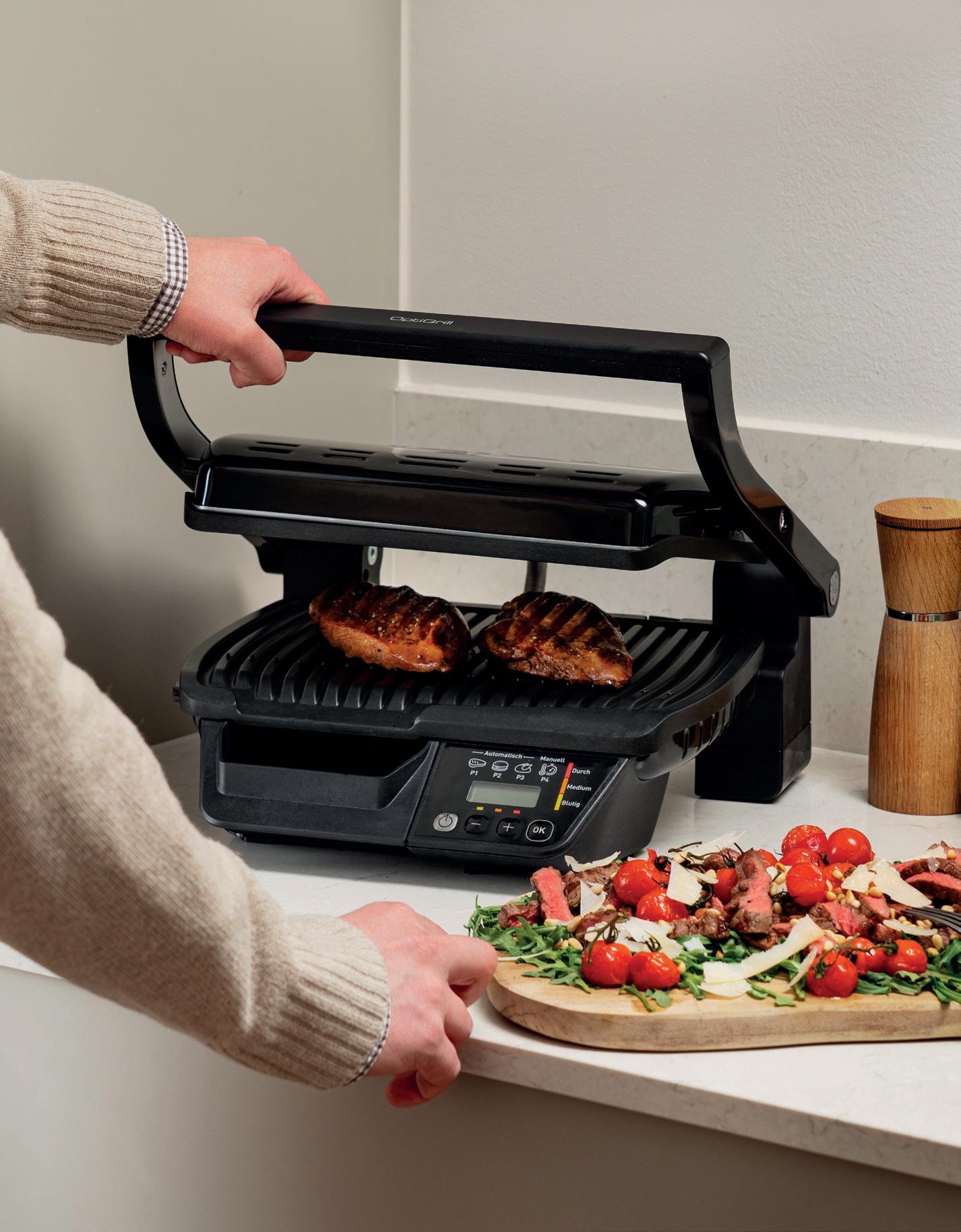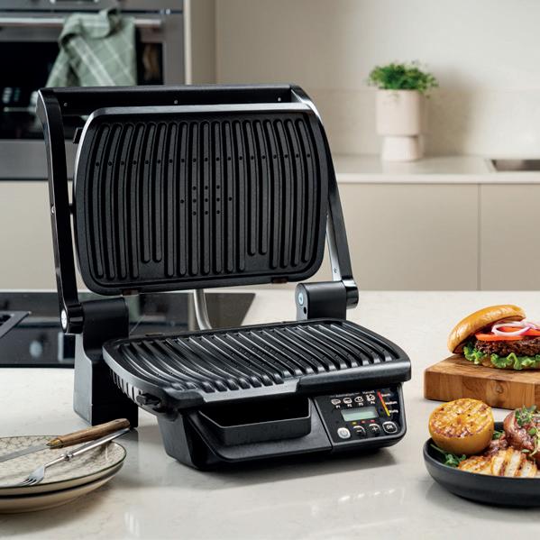 Med Indbygget sensor, der måler tykkelsen og temperaturen på ingredienserne, som skal grilles og digitalt display med indbygget funktion, der viser nedtælling af tilberedningstiden.