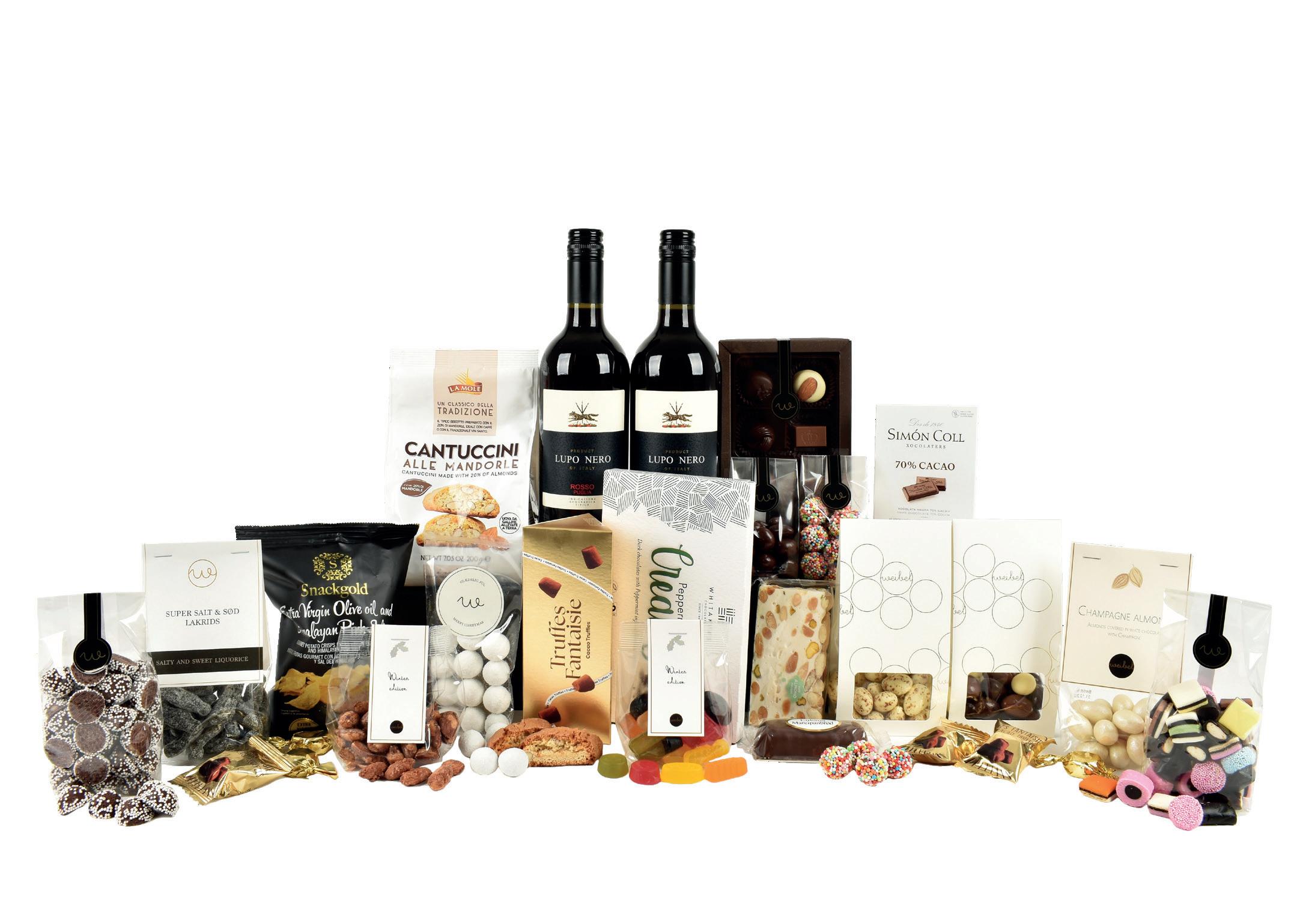 Super salt og sød lakrids 130g, Champagne chokolademandler 100g, Fransk nougatbar med mandler 100g, Appelsin i mørk chokolade 95g, Italienske cantucci med mandel 200g, Brændte mandler 65g, Fyldt belgisk chokolade (8 stk) i æske, Tivolikugler (crunchy chokoladekugler) 83g, Mørk chokoladeplade 85g, Luksus marcipanbrød med mørk chokolade 50g, Chocolate creams i æske (Pebermynte)