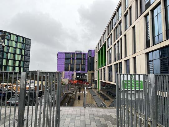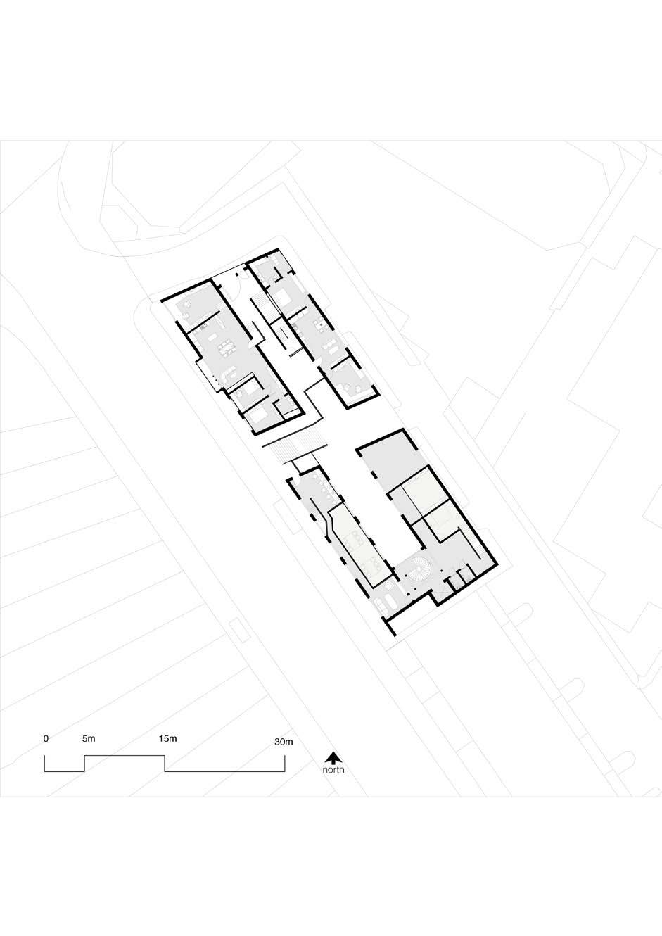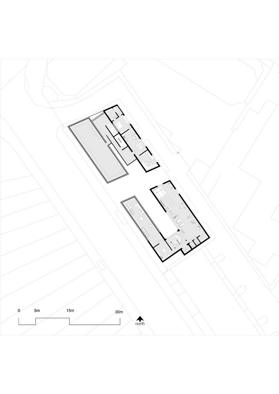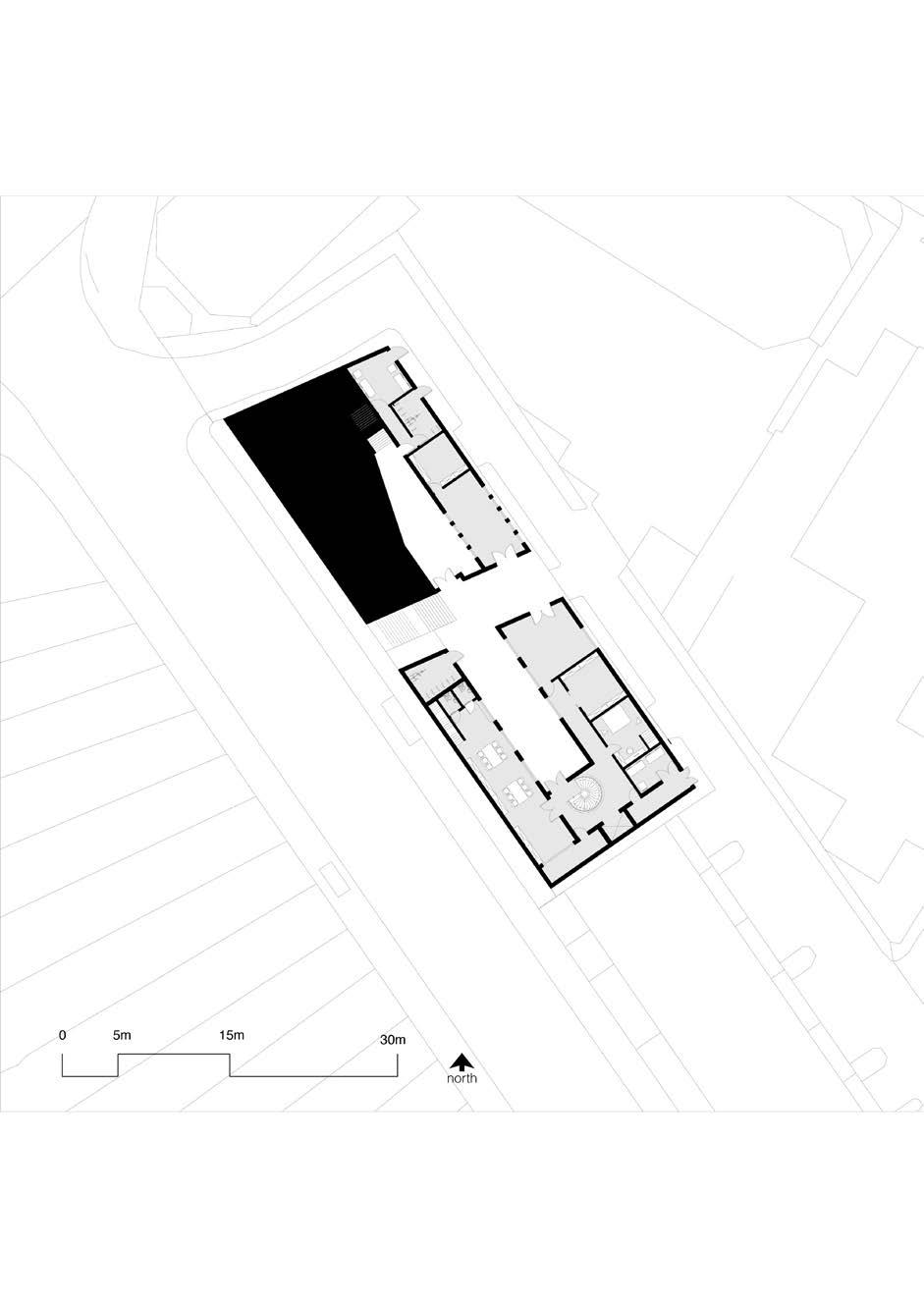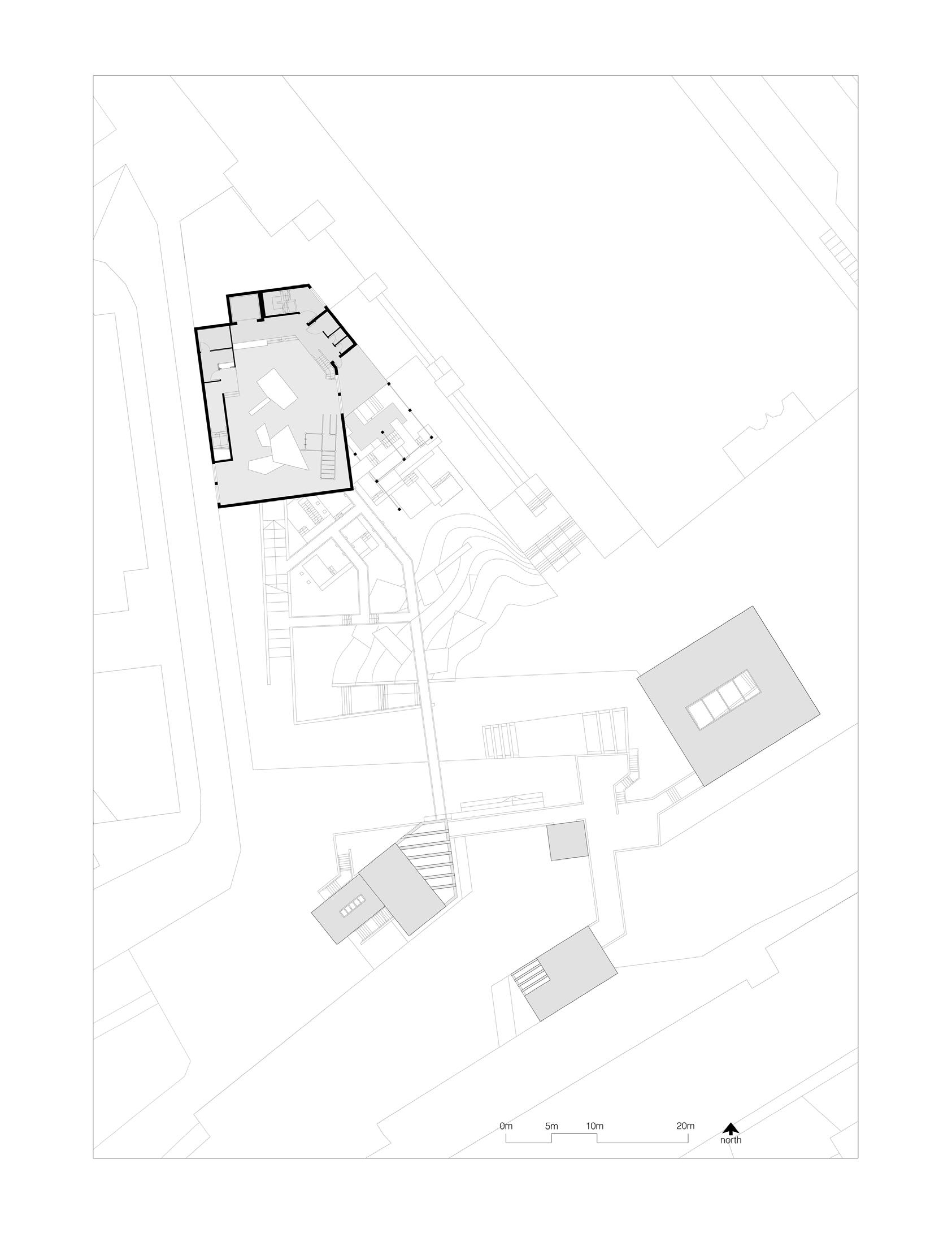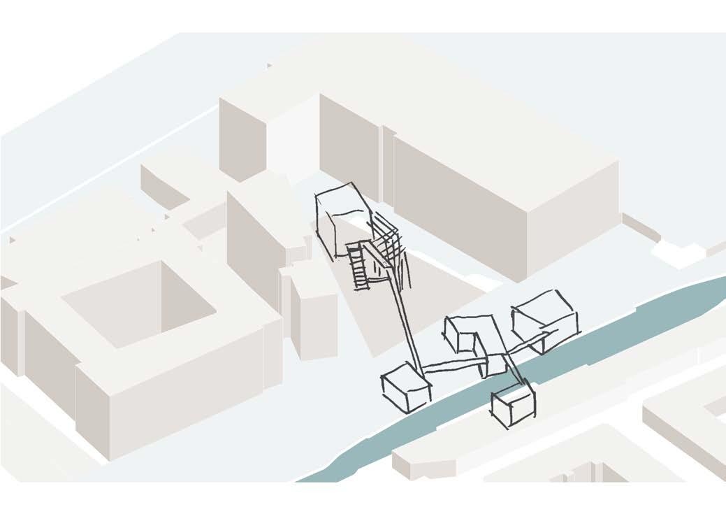The main building has a relatively box-like form, contrasting with the scaffolding and ‘Greeble’ parkour structure seemingly bursting out of the box.