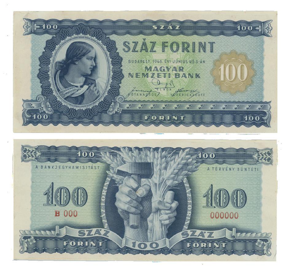A második világháborút követő hiperinfláció elleni harc fontos eszköze volt az 1946 augusztusában kibocsátott új valuta, a forint. Elsőként a tíz- és százforintos címlet látott napvilágot. E bankjegyek átmeneti időtartamra, ofszetnyomással készültek és néhány évig voltak csak forgalomban (a tízforintos címlet 1946. augusztus 1-től 1948. március 31-ig, míg a százforintos 1946. augusztus 7-től 1951. május 1-ig).