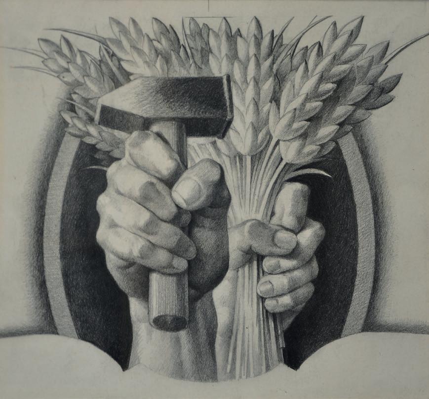 Horváth Endre ceruzarajza a 100 forintos hátoldalához. Egy korabeli újságcikk arról számolt be, hogy az erőteljes kéz modellje Nagy István bokszbajnok volt.