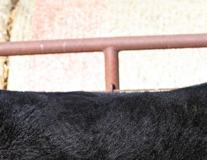 This particular bull pen o ers more calving ease options than ever before, and without sacri cing performance or phenotype, thanks to some of the sires we utilized with big spread from birth to weaning. The Resilient sons make up the largest AI sire group, and they exemplify that small birth, calving ability combined with curve bending performance. He was used on both heifers and mature cows, and you will see many sons throughout the o ering with heifer friendly birthweights, above average weaning weights, and they will be the heaviest sire group on sale day. The Jackon sons are mostly on the younger end of the o ering, but they o er extra muscle and hair with traditional Angus heads and breed character. This will be the rst o ering of Homegrown sons; he was used on heifers and the sons o er breed leading calving ease and birthweight with added length of body. In terms of management and development, the bulls are weaned in Late September and put onto a piece of banked grass for the remainder of the fall, we introduce hay and oats to them while they are still grazing and they remain on a 5-acre pasture until the New Year. At this point they move into big pens that still allow for ample exercise and transition onto a silage based TMR. The bulls are handled lots and we feel that the docility on the entire bull pen is very good.