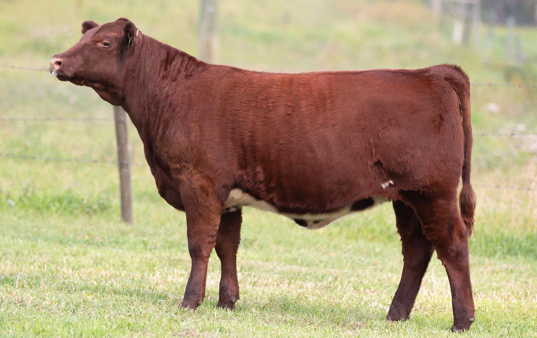 Claudia is as thick as she is tall, easy fleshing and very smooth throughout her topline. She is a very kind, docile, loving heifer, that would work well for a junior or firsttime breeder going on show road. She even has a ton of length and doesn’t break in loin while moving out, polled and colour to boot.