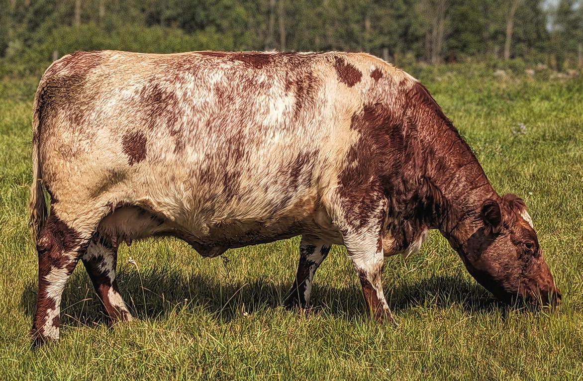 Clay and I did a lot of research and studying of bull pedigrees and bloodlines and spoke to a lot of breeders of bulls that intrigued us. Our decision to cross 30B with Little Cedar Worldwide 1979 is a mating we are extremely excited about. Winning Reserve National Champion in both 2020 and 2021 at Denver and Oklahoma and now siring many top selling daughters across the States, this bull went to the top of our list. We feel the combination of 30B’s broodiness, maternal capabilities and body type, crossed with Worldwide’s style and performance is going to drop some calves that will be the talk of the Canadian Shorthorn Breed. Powerful in the show ring or the pasture is our goal for this crossing. We believe in our decision so much for this mating that we have decided this will be the only offering up for grabs.