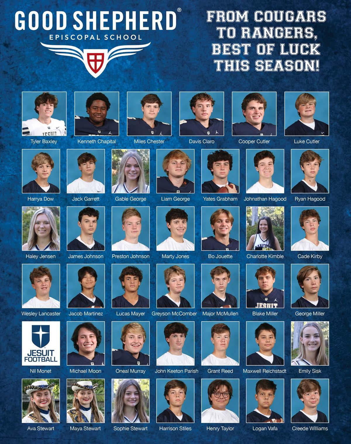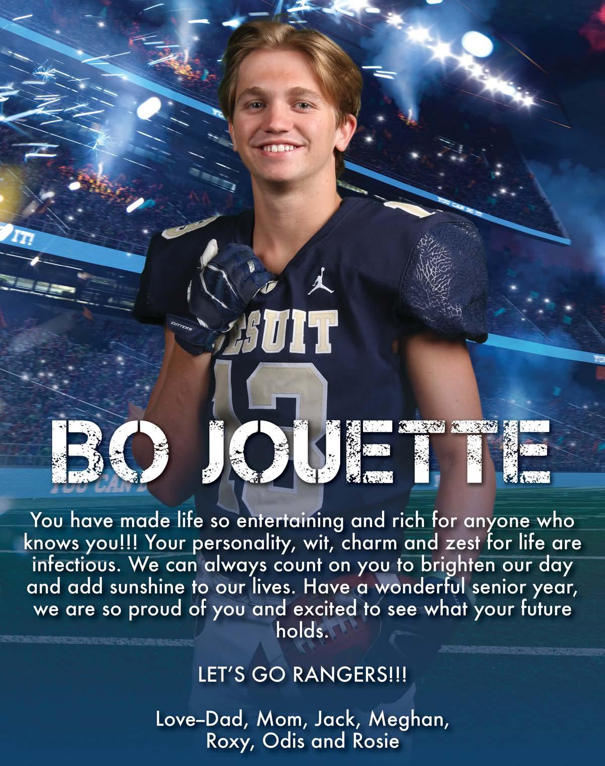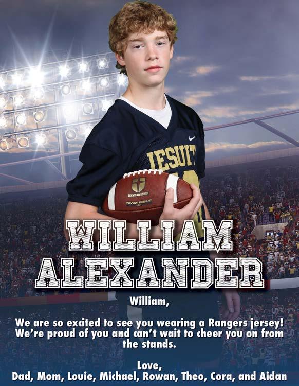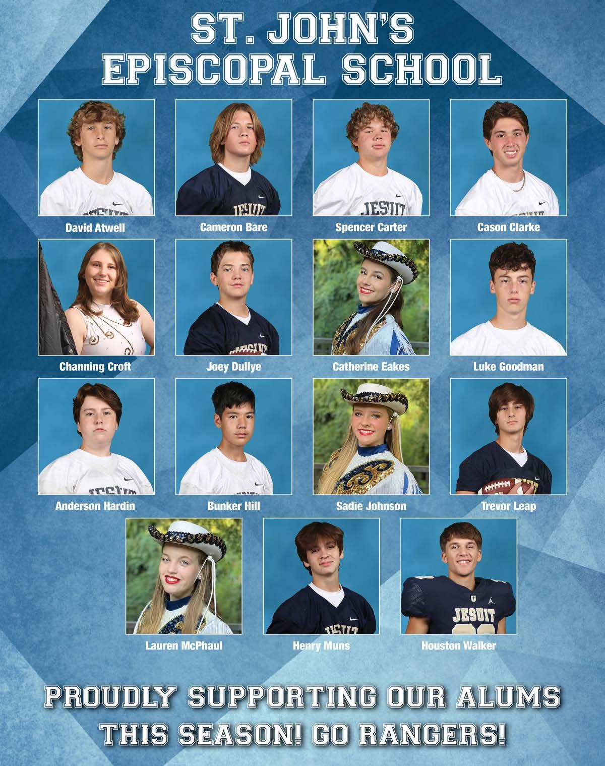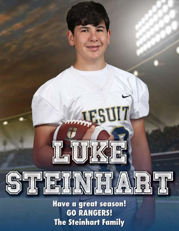 The 2022 Jesuit Dallas Football Program is a production of the Jesuit Dallas Sports Information Office. Program Designer: Bryan Montgomery, Sports Information Director. Editorial Team: Aimee French, Heather Holman, James Kramer, Candice Price. Photography: Jowdy Photography (Football Action Photography), Legacy Studios (Football, Band Photography), Francis Celii Photography (Football Action Photography), Lisa Manis Crenshaw Photography (Rangerettes Photography), Kendra Sawyer (Cheerleader Photography). Printer: Cultro Group.