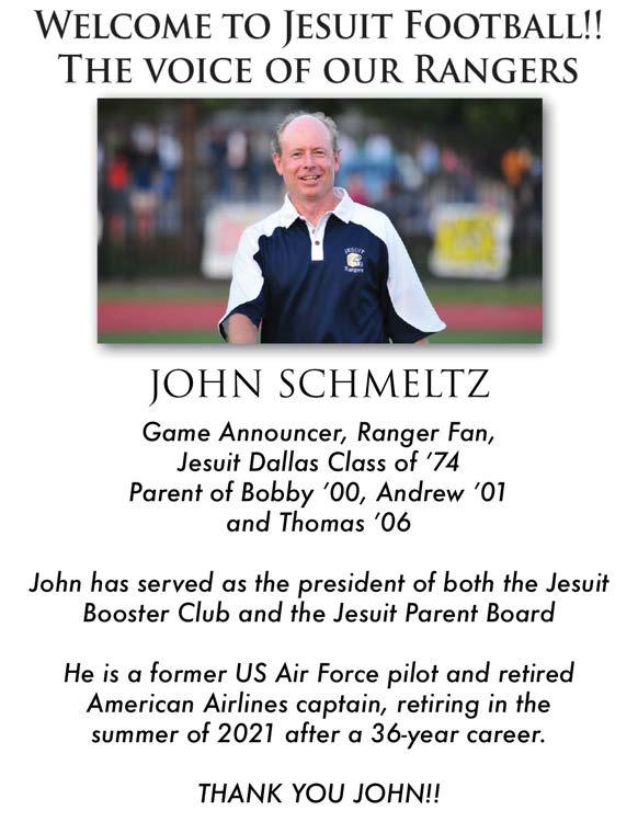 Advertiser Index ...................................... 4 Program Credits 4 About Jesuit Dallas 5 Admin & Support Staff 5 Head Coach Brandon Hickman 6 Jesuit Dallas History & Tradition ........... 8-9 Jesuit Dallas Coaching Staff 13-16 Dell Performance Center 17 Jesuit Dallas Athletic Training ................ 21 Varsity Football Position Groups 24-27 Jesuit Dallas Football Class of 2023 32-51 Jesuit Dallas Football Radio 85 Varsity Football Roster 86 Varsity Football Schedule ...................... 87 Varsity Football Student-Athletes 88-91 Junior Varsity Roster 94 Junior Varsity Schedule ......................... 95 Junior Varsity Student-Athletes 98-100 Freshman Roster 106 Freshman Schedule 107 Freshman Student-Athletes 110-117 Jesuit Dallas Rangerettes ............. 121-133 Jesuit Dallas Cheerleaders 145-149 Jesuit-Ursuline Ranger Band 163-170