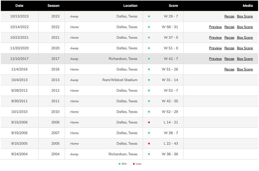 Sept. 13 Highland Park Gerald J. Ford Stadium L, 20-43 (1-2)
