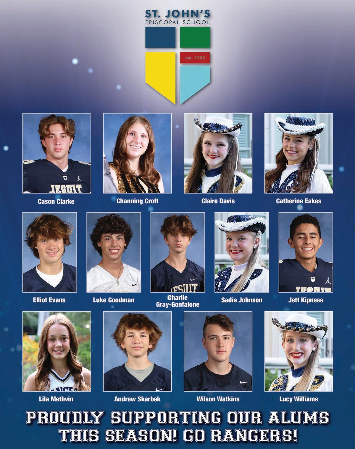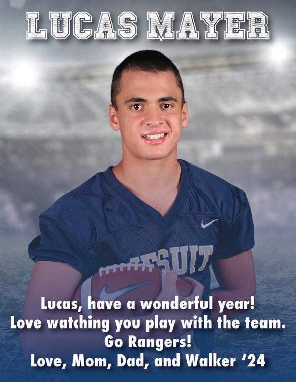 Dr. Robert Duvall Athletic Trainer Michael Proctor Athletic Trainer Kimberlie Scales Director of Communications James Kramer Director of Alumni Relations ......................................... Sean McMullen ’96 Sports Information Director Bryan Montgomery Asst. Sports Information Director Patrick Rhatican ’09 Head Football Coach • Offensive Line Brandon Hickman Asst. Head Coach • Inside Linebackers • JV Blue Head Coach Paul Maturi Defensive Coordinator • Secondary Don Woods Co-Offensive Coordinator • Quarterbacks John Livingstone Co-Offensive Coordinator • Wide Receivers Patrick Rhatican ’09 Head Freshman Coach ............................................... Bob Wunderlick ’84 Asst. Varsity Coach • Secondary Charlie DeLong Assistant Varsity Coach • Wide Receivers Charles Hinton, Jr. Asst. Varsity Coach • Running Backs • JV Gold Head Coach Corey Pointer Asst. Varsity Coach • Defensive Line..................................Billy Thompson Asst. Freshman Coach • Defensive Line Jose Aquino Asst. Freshman Coach • Quarterbacks Sean Gavin ’00 Asst. Freshman Coach • Running Backs Bill Henly Asst. Freshman Coach • Offensive Line Rick Leal Asst. Freshman Coach • Outside Linebackers ...................... Ryan Menard Asst. Freshman Coach • Wide Receivers Casey Profitt Asst. Freshman Coach • Wide Receivers Matt Upton ’02 Asst. Freshman Coach • Defensive Backs Robert Williams Band Directors Donovan Putnam ..........................................................................................Zane Crownover Head Cheerleading Coach Laura Sayers Assistant Cheerleading Coaches Scott Gambrel ’09 ...........................................................................................Crystal Joschko ............................................................................................Kendra Sawyer Director of Rangerettes Linda Coffin Assistant Rangerettes Director Katie Johnston