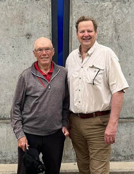 Gary Johnson ’56 and Bob Morgan ’71 pose outside of Ranger Stadium after a campus tour.