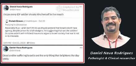 Posting on Twitter/X on 23 October, the pathologist, who previously worked at the Royal Free Hospital in Hampstead, also wrote: “Dead and/or su ering Israelis are the only thing that brightens the day lately.”