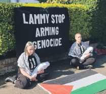 Two female activists from the group Youth Demand put fake babysize body bags outside the property, along with a sign on the hedge reading “Lammy Stop Arming Genocide”.