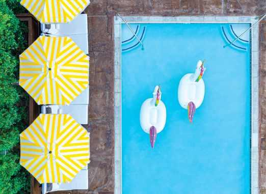 The Dena pool is pure Palm Springs, complete with unicorn floats and, best of all, there are dogs sat around the guests sipping cocktails, none of whom mind because the hotel is dog friendly. Very, and with good reason. The property is next door to the Pasadena Civic Auditorium, where America’s Got Talent is filmed and there have been many canine contestants. Israel’s sensational dog-dancing duo Roni and Rhythm stayed at the Dena and, according to staff, were the perfect guests. The hotel’s generous pet policy has also accommodated local people with dogs who lost their homes in the fire or were waiting for the toxic fumes to fade.