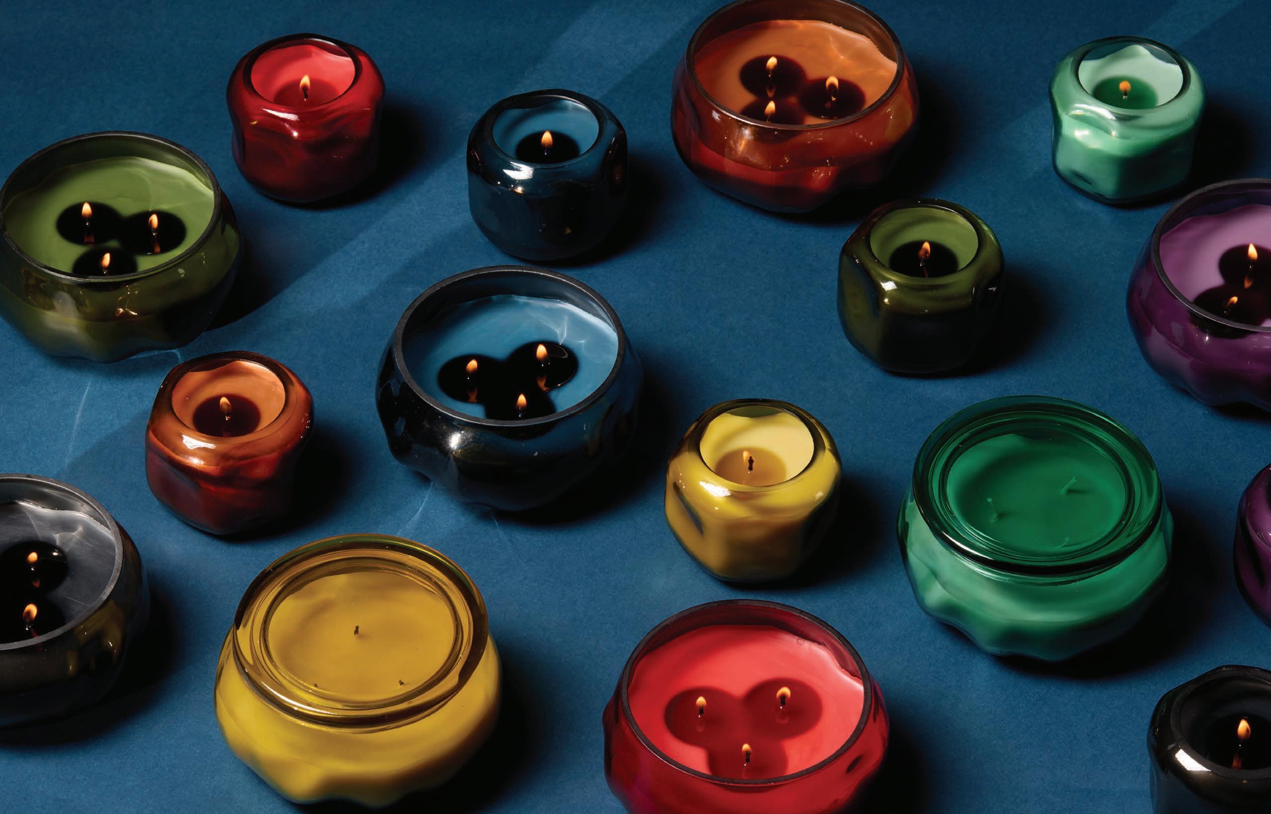 • FESTIVE COLLECTION OF TINTED RIBBED GLASS IN RICH HUES & SCENTS!