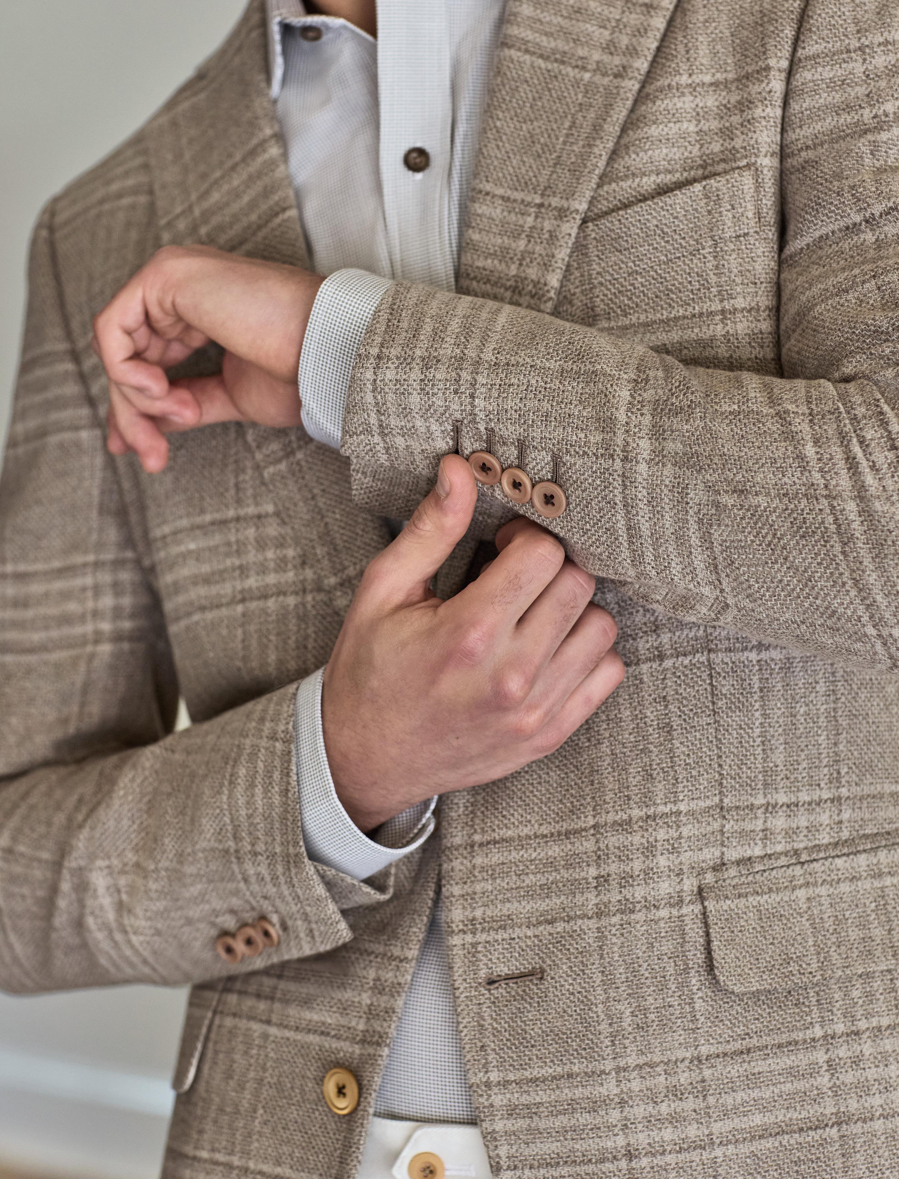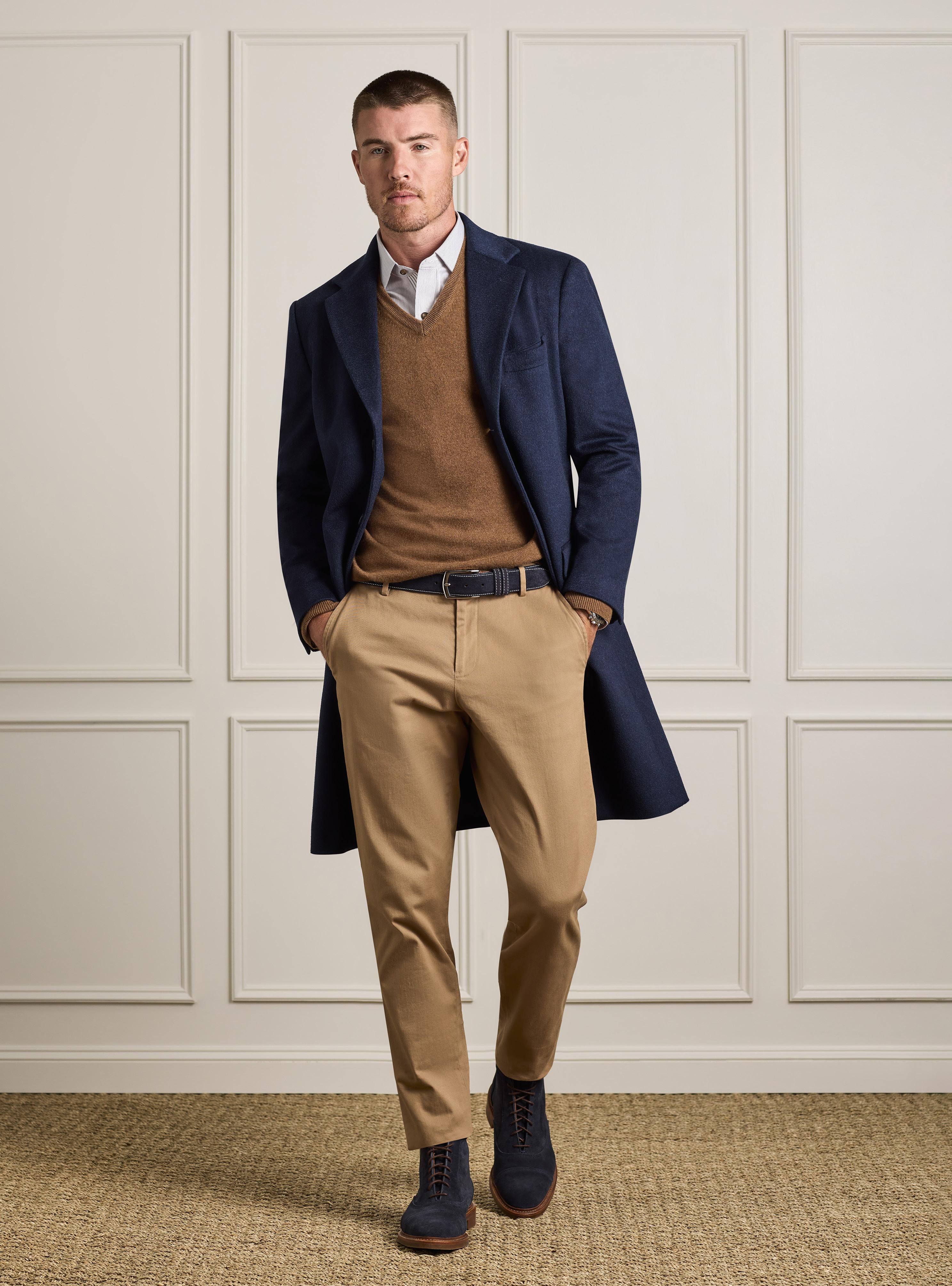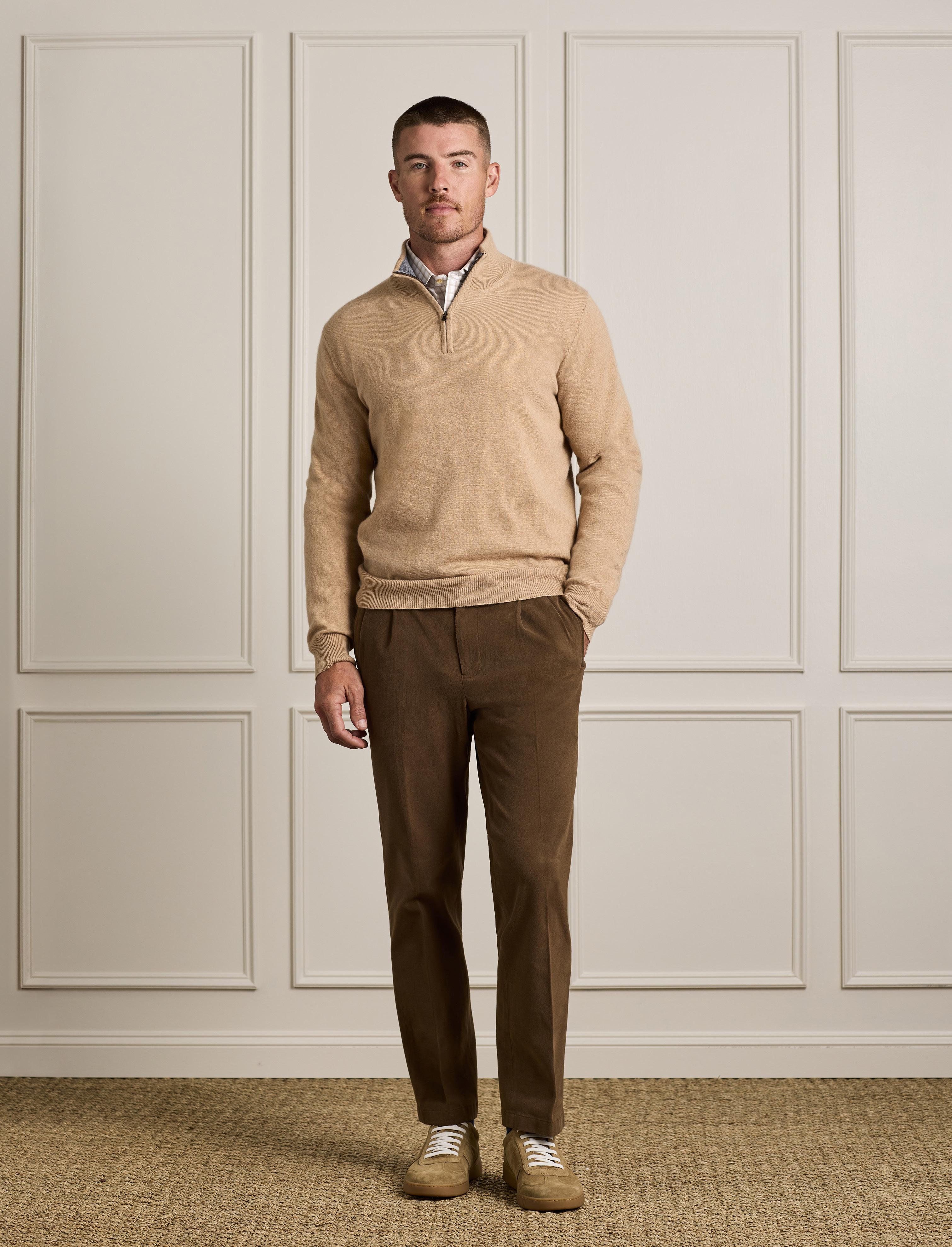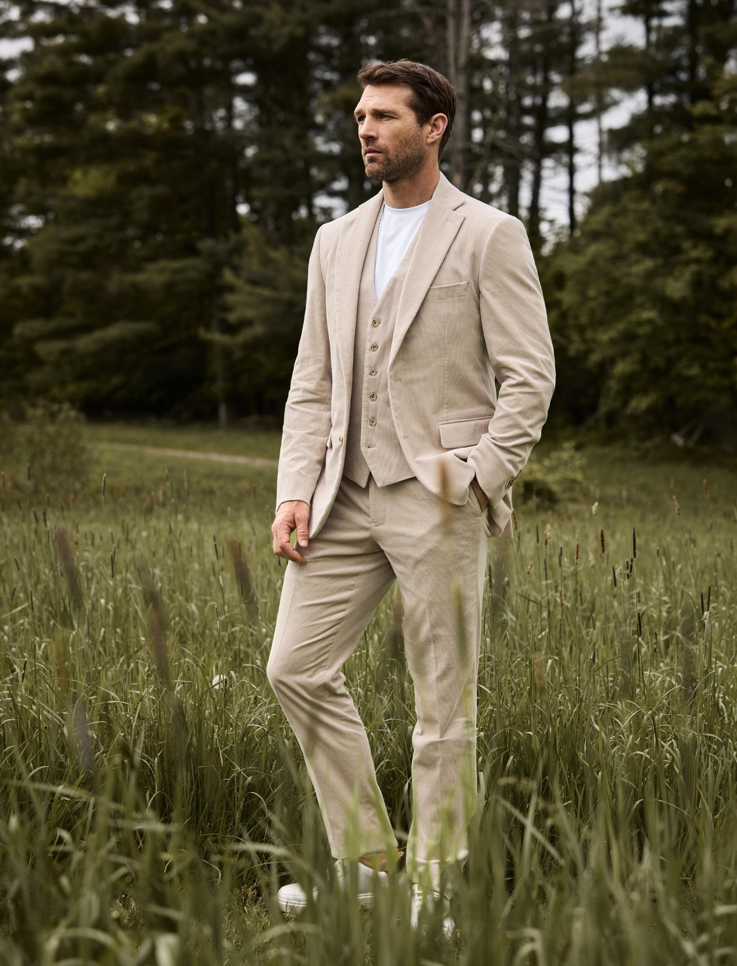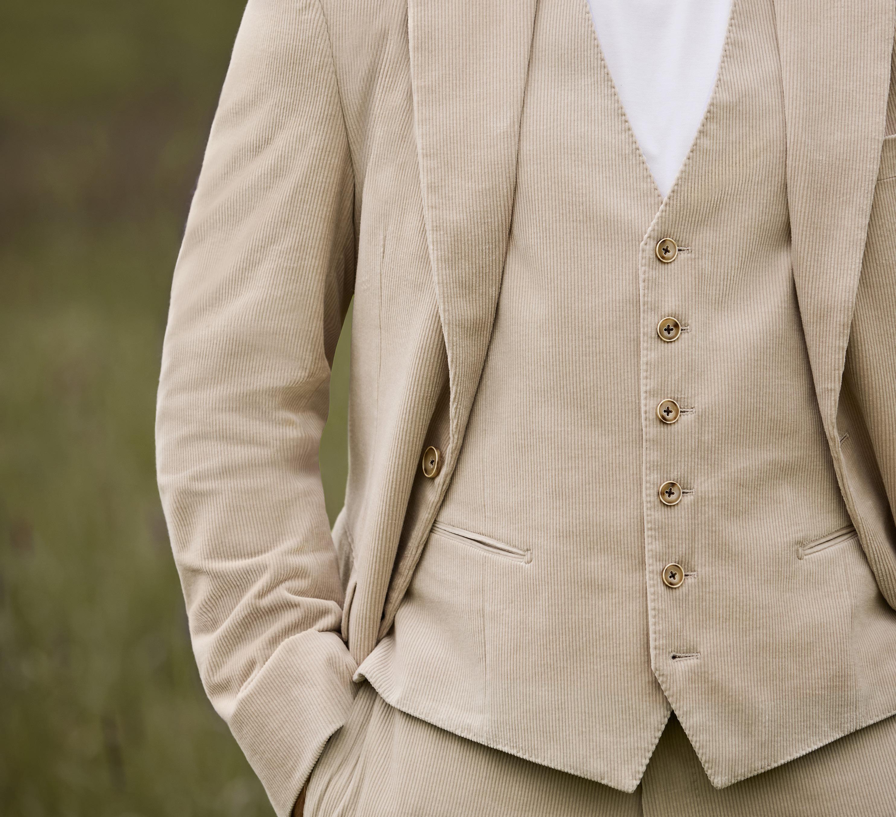 Our custom-made sportcoat, vest, and trousers in our new luxurious Cashmere Corduroy are practical yet stylish. This refined blend of cashmere and cotton delivers a rich texture and uniquely soft handfeel. Featured above in Natural Cashco Cord from Lanificio Ermenegildo Zegna.