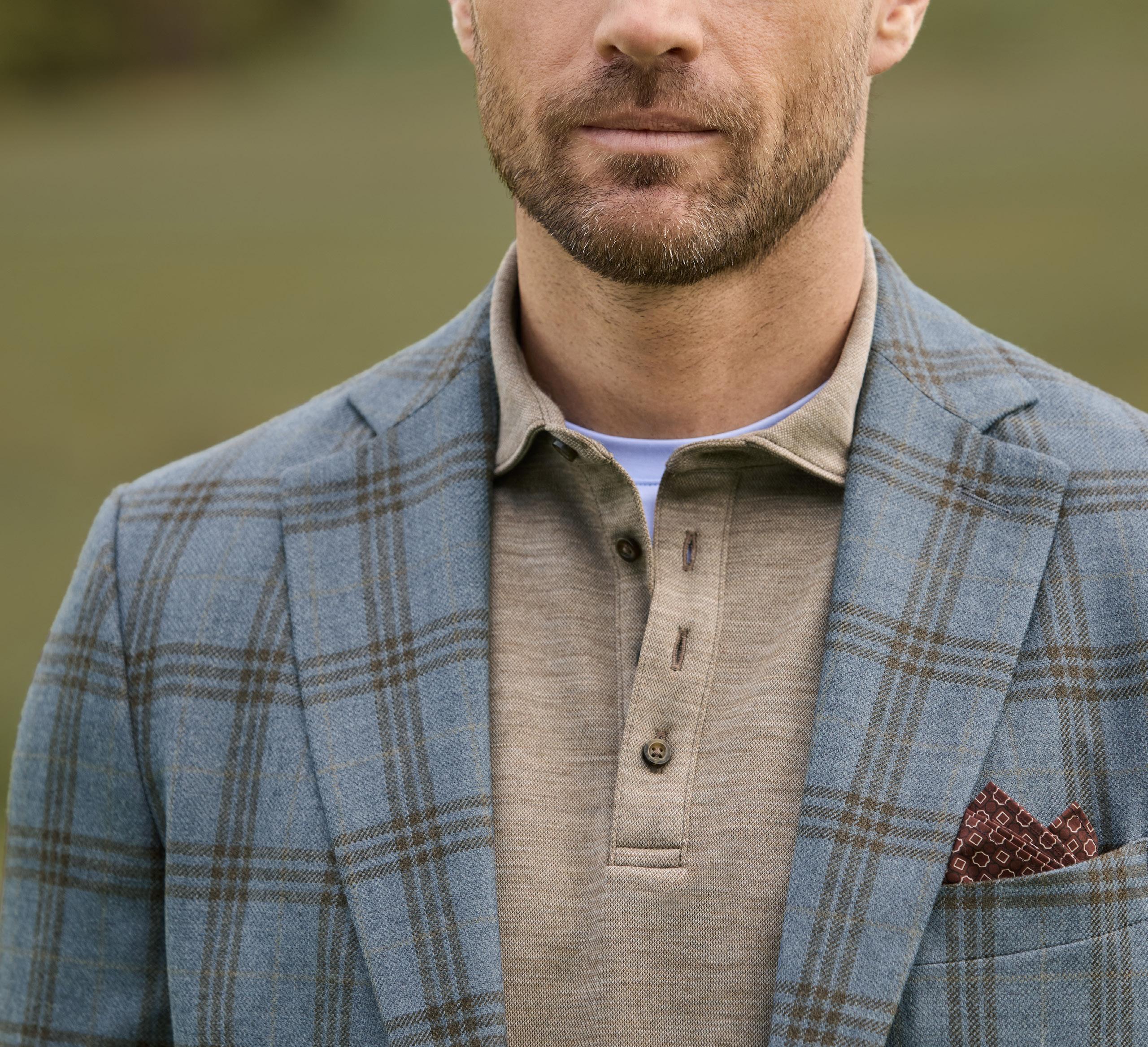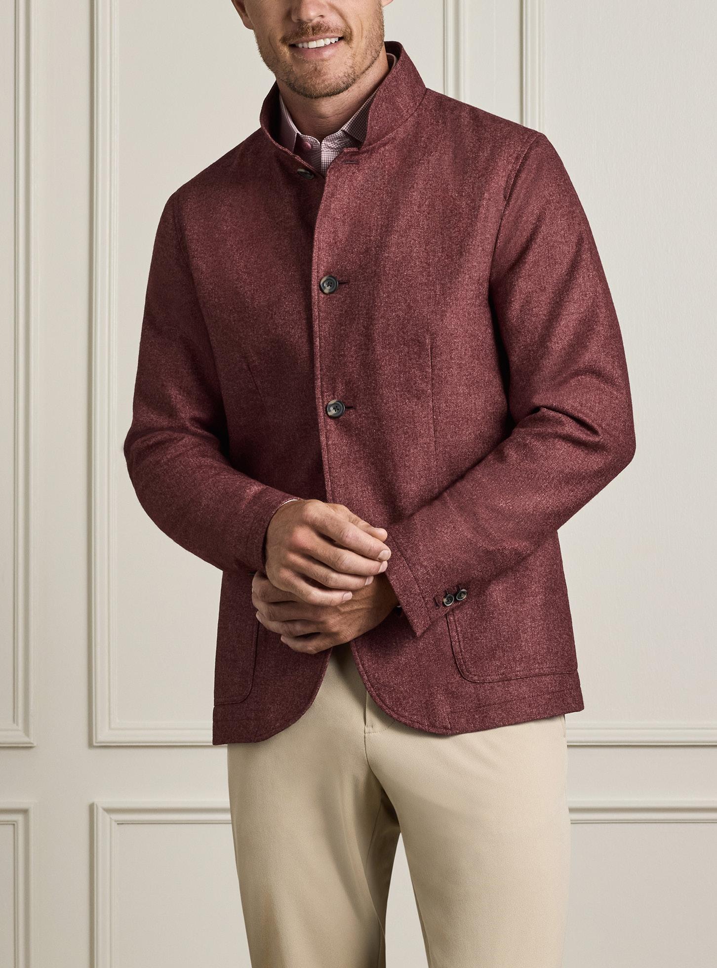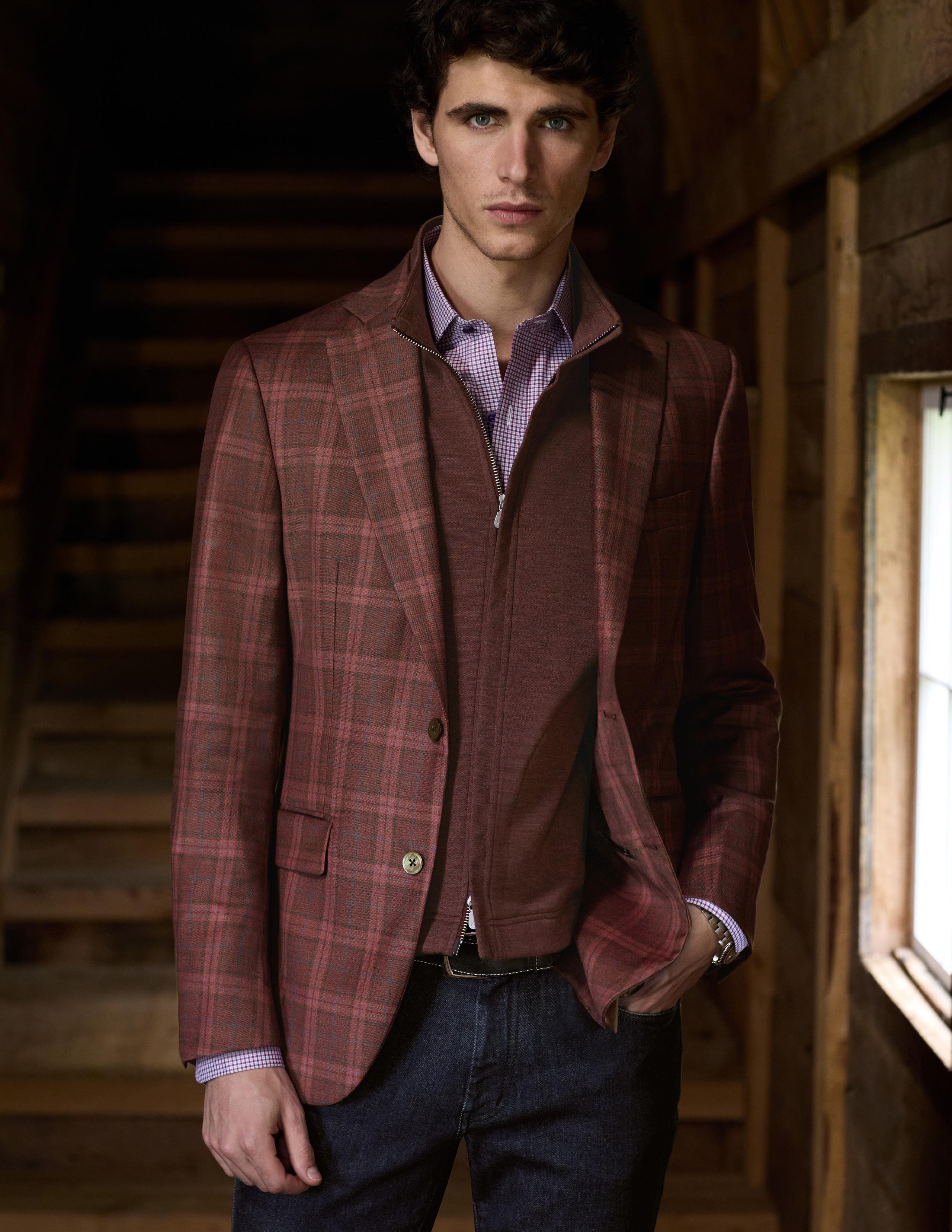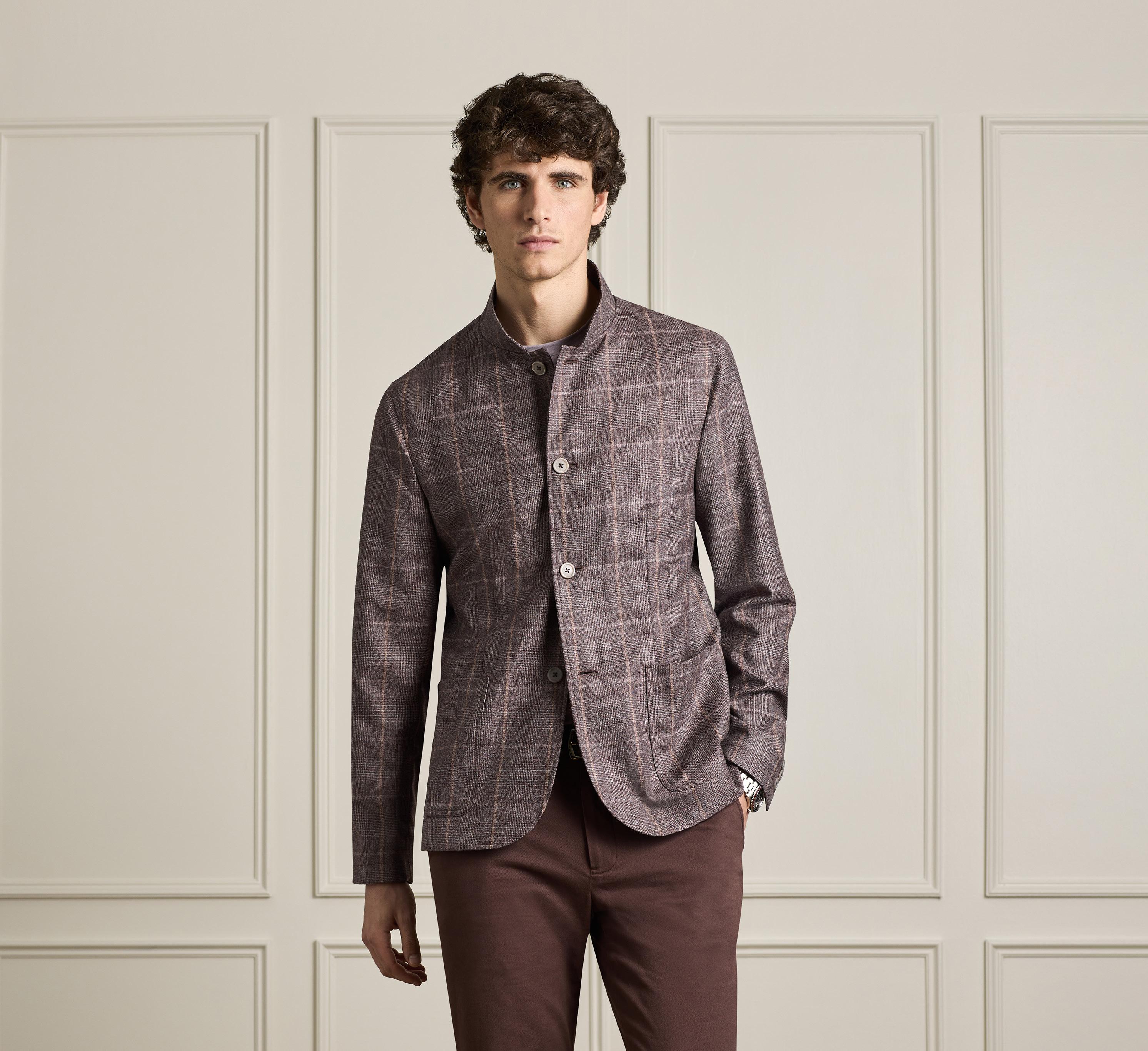 Our new Stand Collar style offers a relaxed take on tailoring. Inspired by military design and Tirolo tradition, the stand collar pairs effortlessly with the fabric’s soft drape and custom fit to create a modern, versatile look. Shown above: the Stand Collar Hybrid Blazer in Burgundy Tonal Plaid from Marzotto.