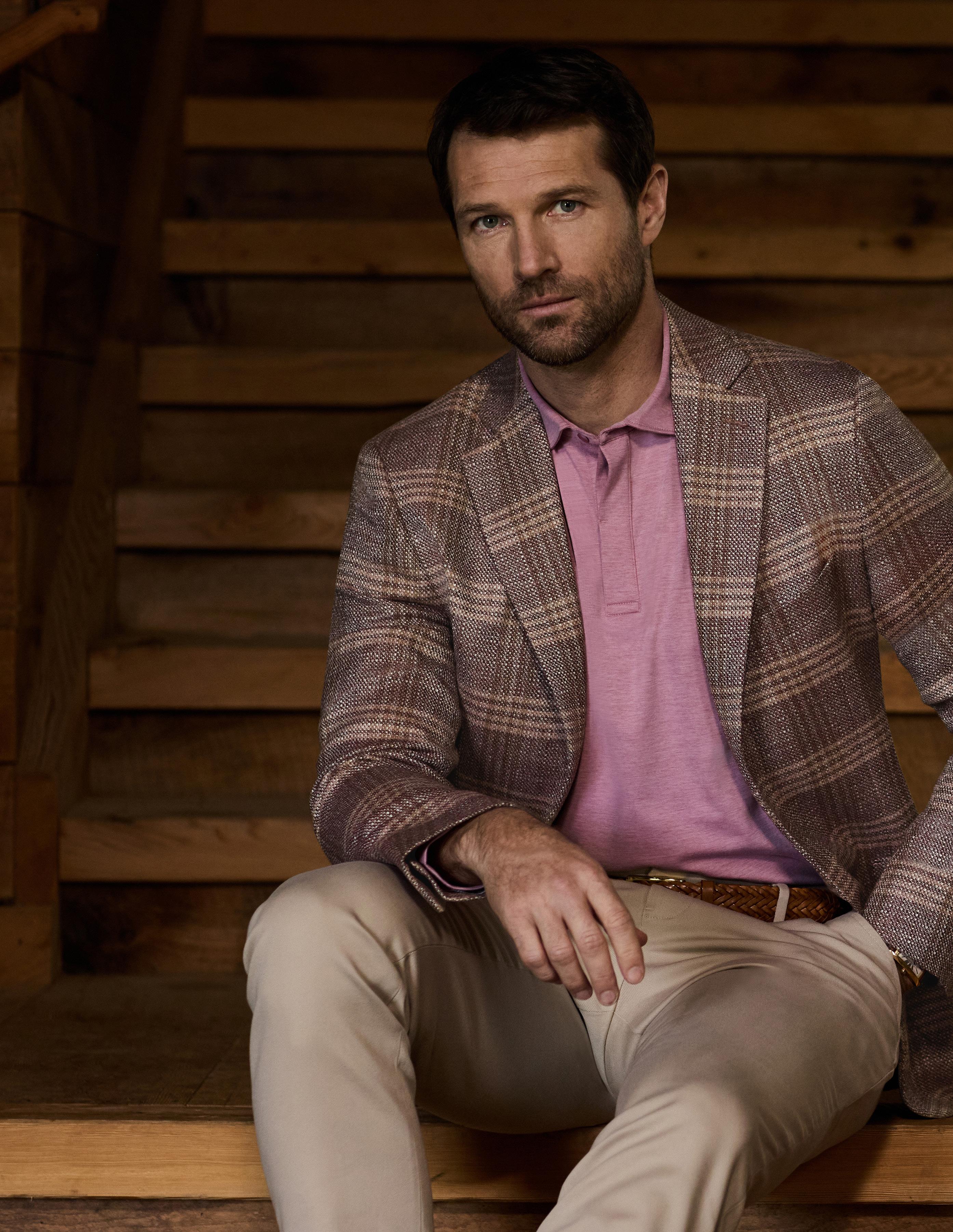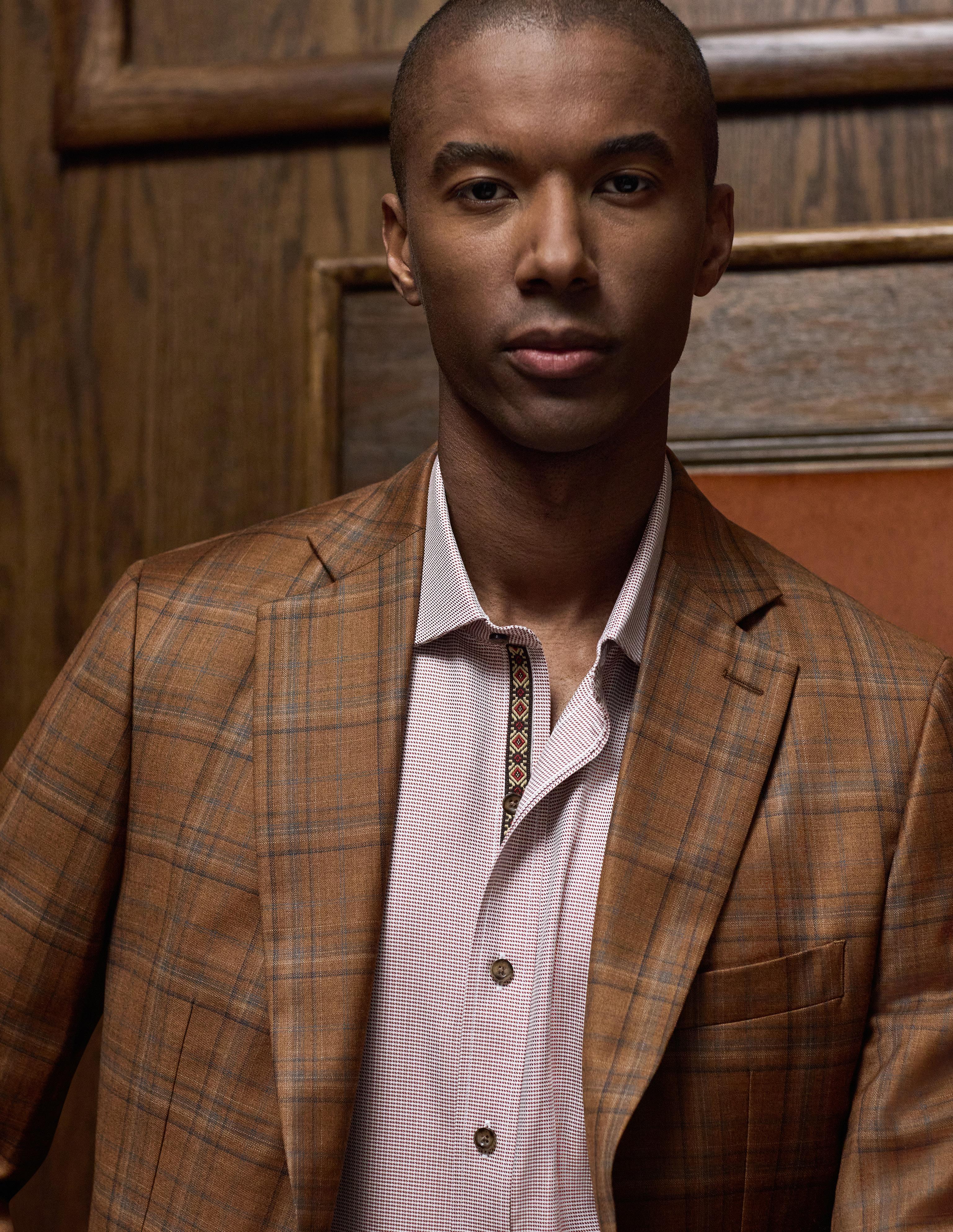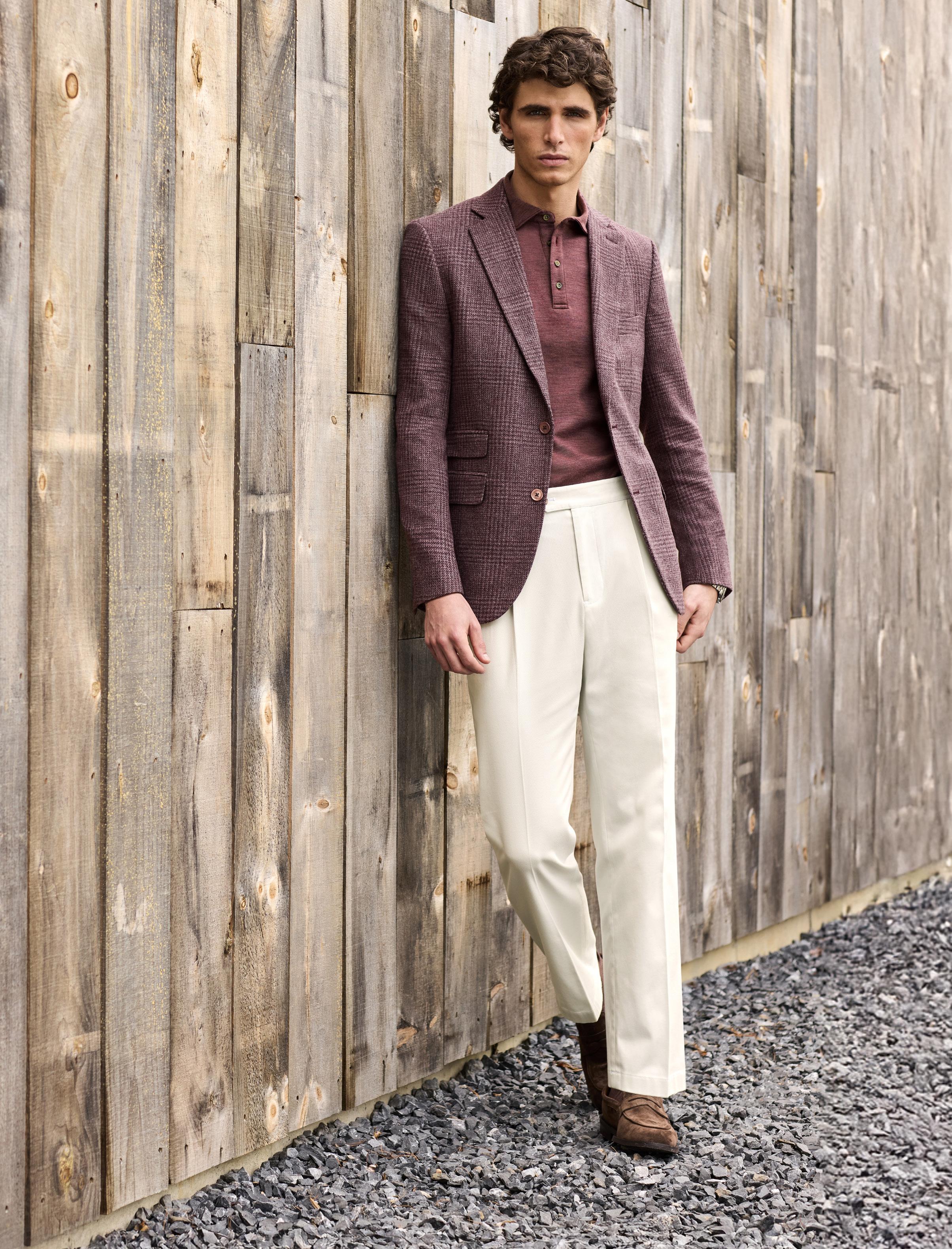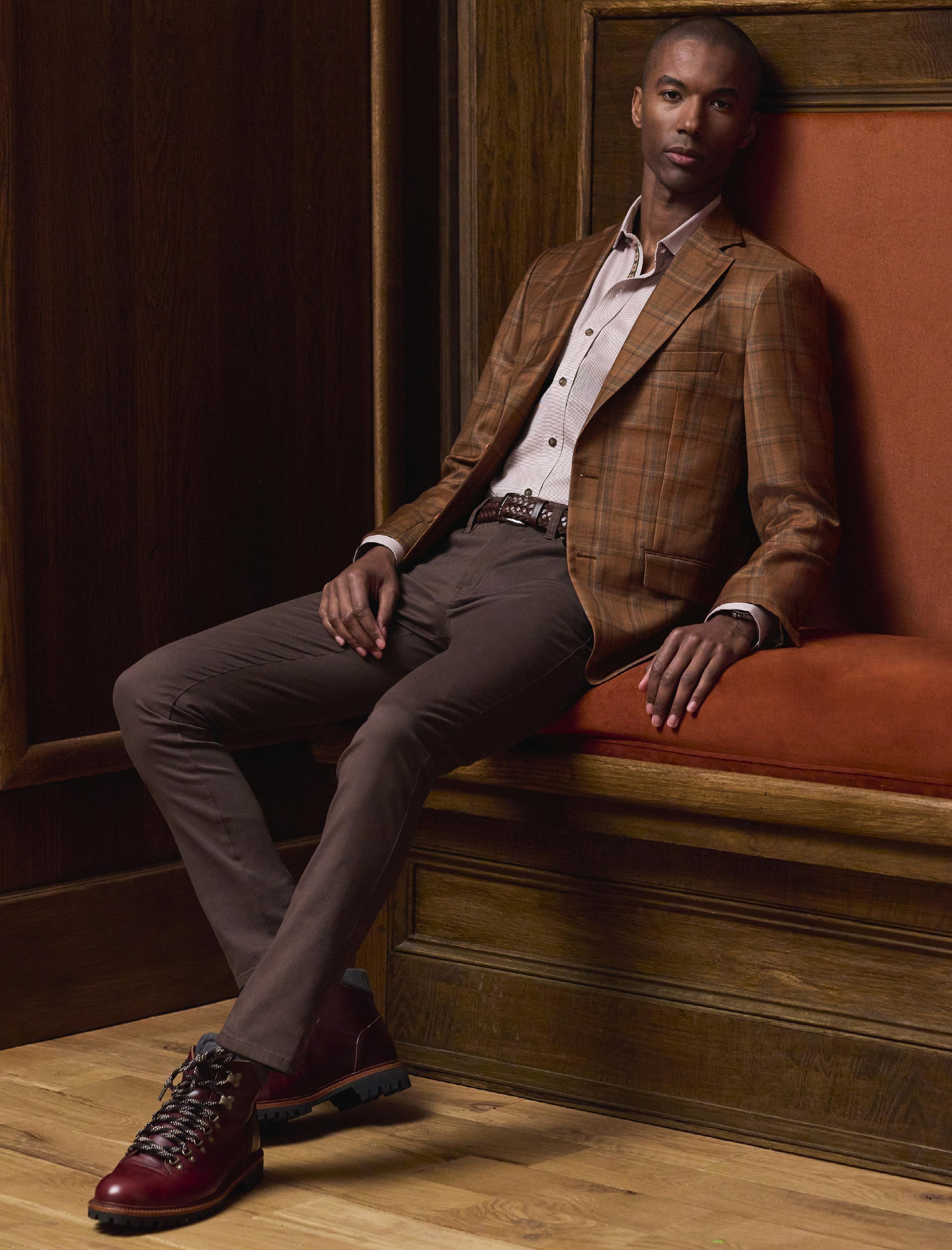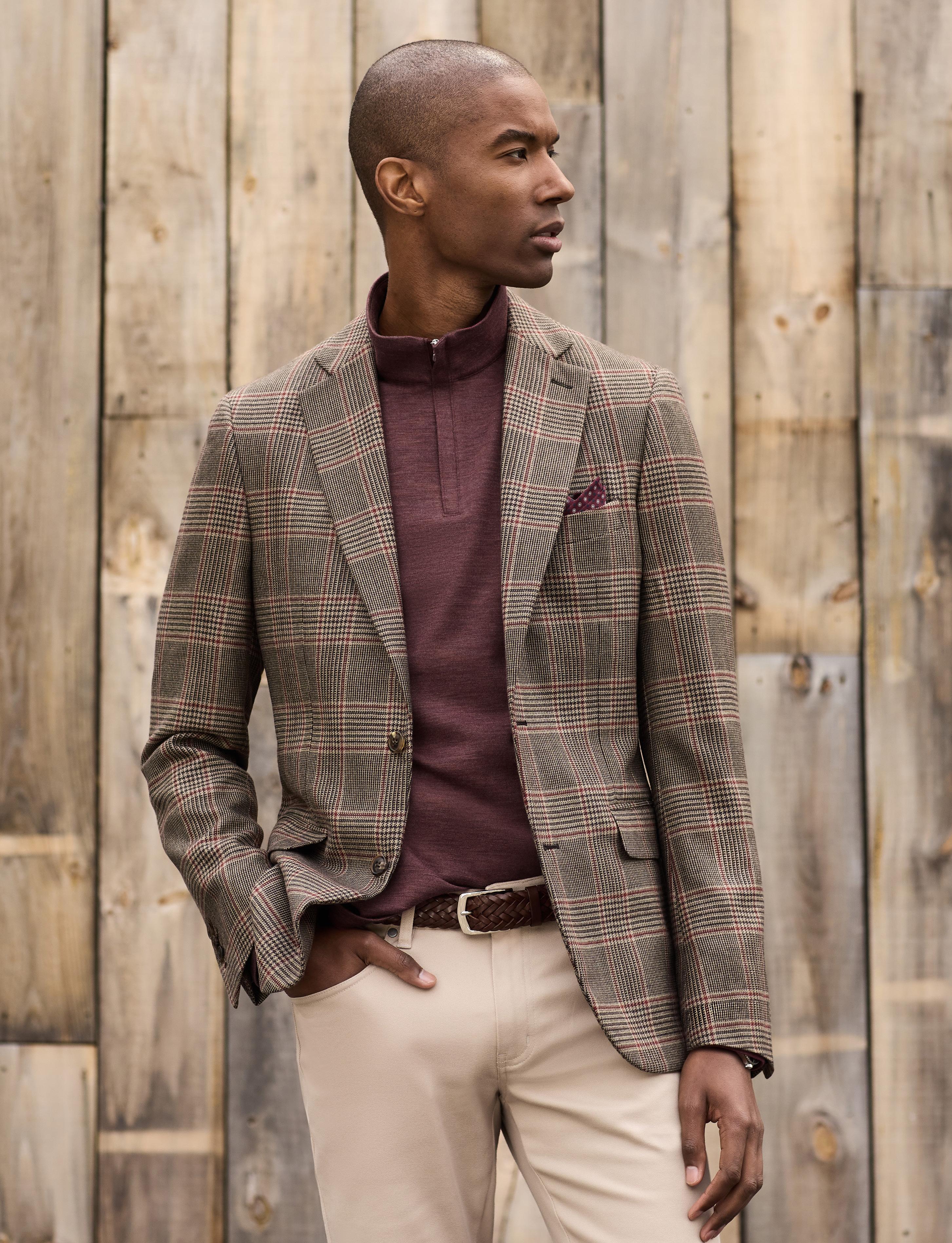 Our new Stand Collar style offers a relaxed take on tailoring. Inspired by military design and Tirolo tradition, the stand collar pairs effortlessly with the fabric’s soft drape and custom fit to create a modern, versatile look. Shown above: the Stand Collar Hybrid Blazer in Burgundy Tonal Plaid from Marzotto.