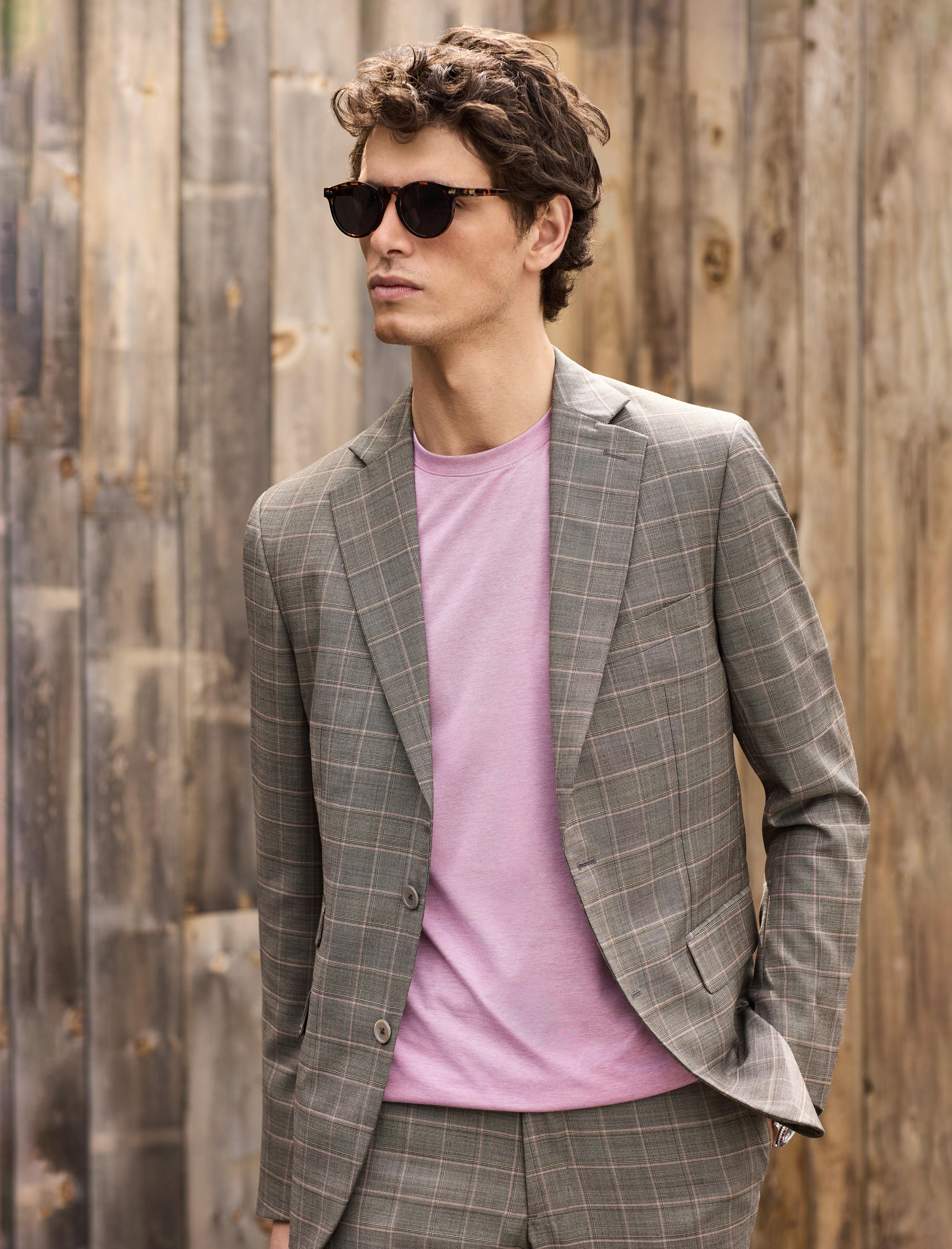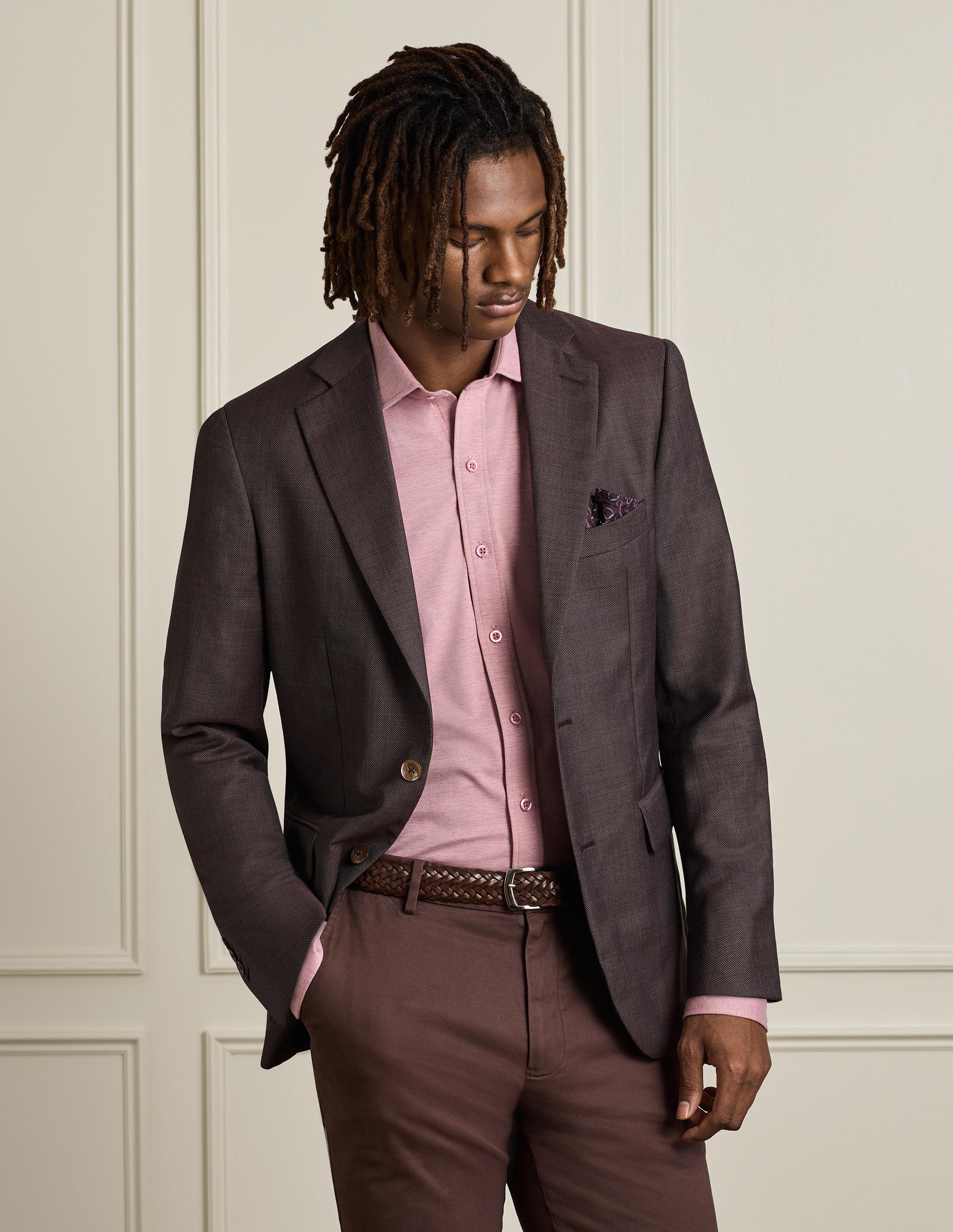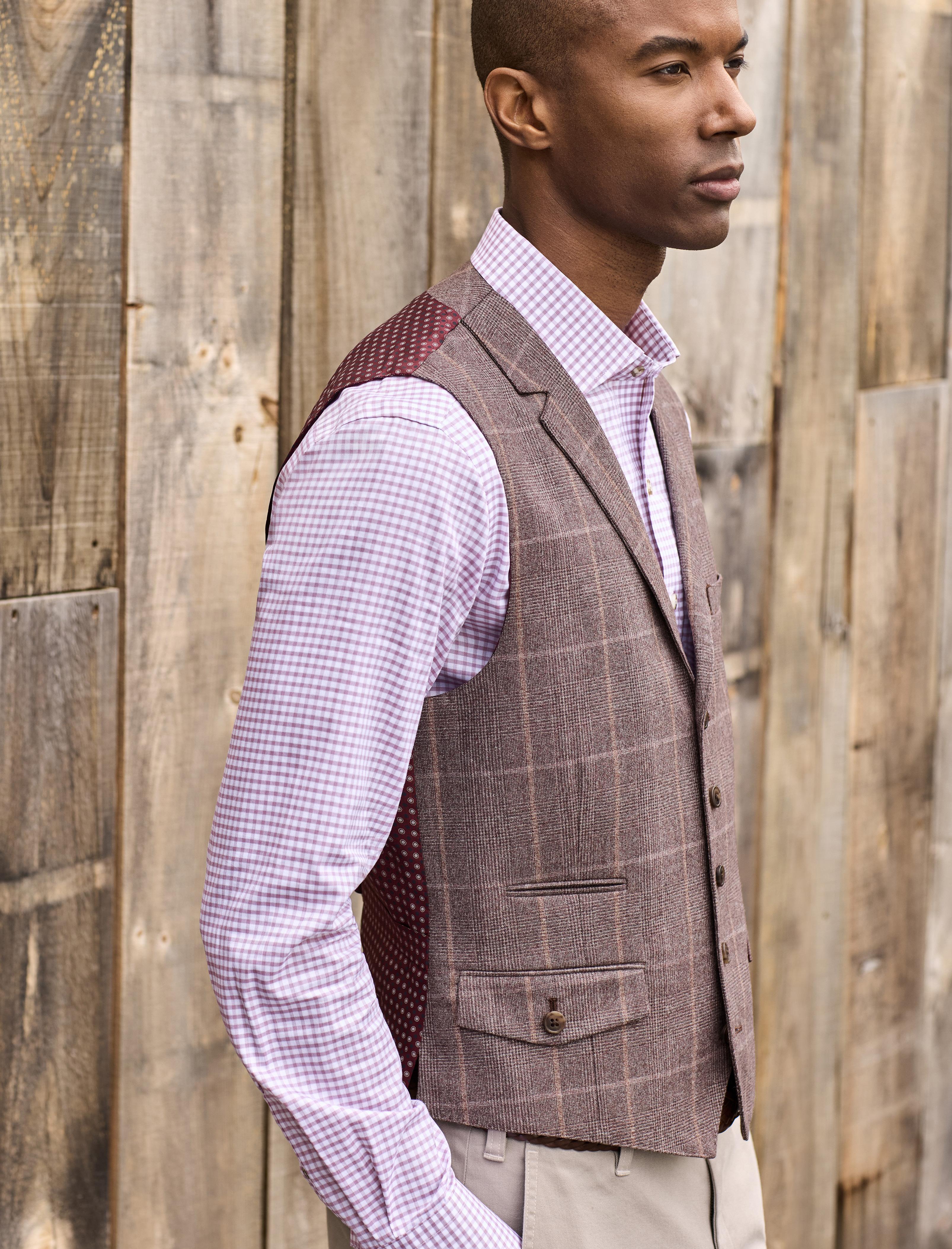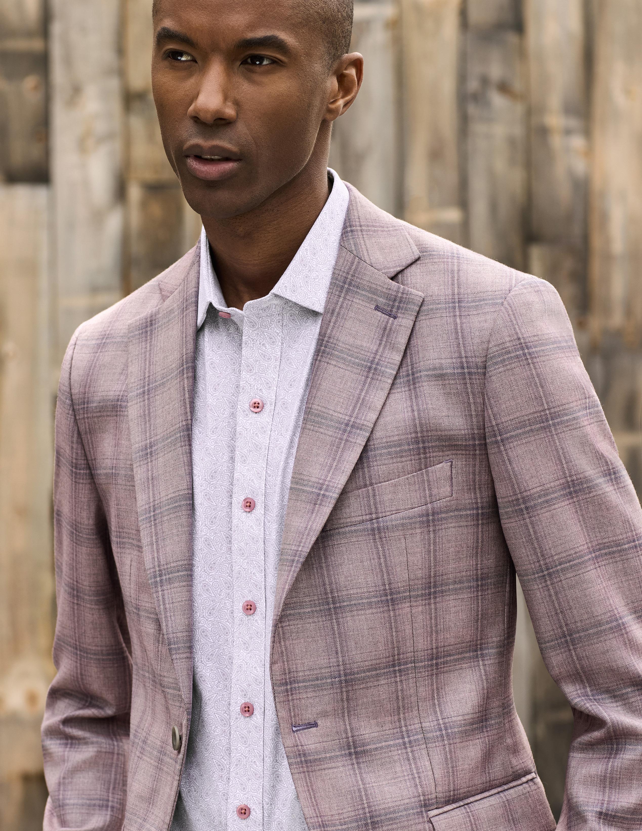 Our new Stand Collar style offers a relaxed take on tailoring. Inspired by military design and Tirolo tradition, the stand collar pairs effortlessly with the fabric’s soft drape and custom fit to create a modern, versatile look. Shown above: the Stand Collar Hybrid Blazer in Burgundy Tonal Plaid from Marzotto.