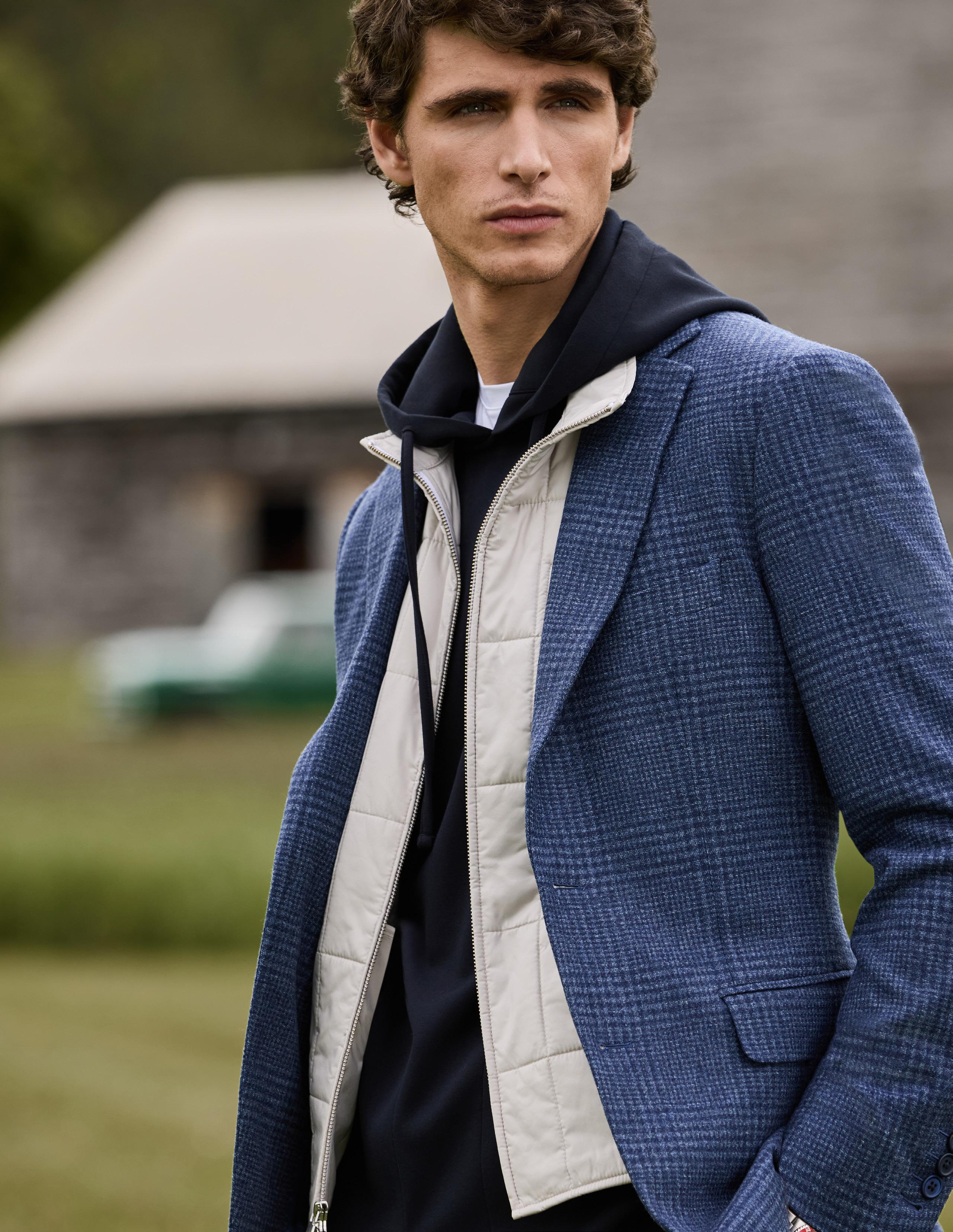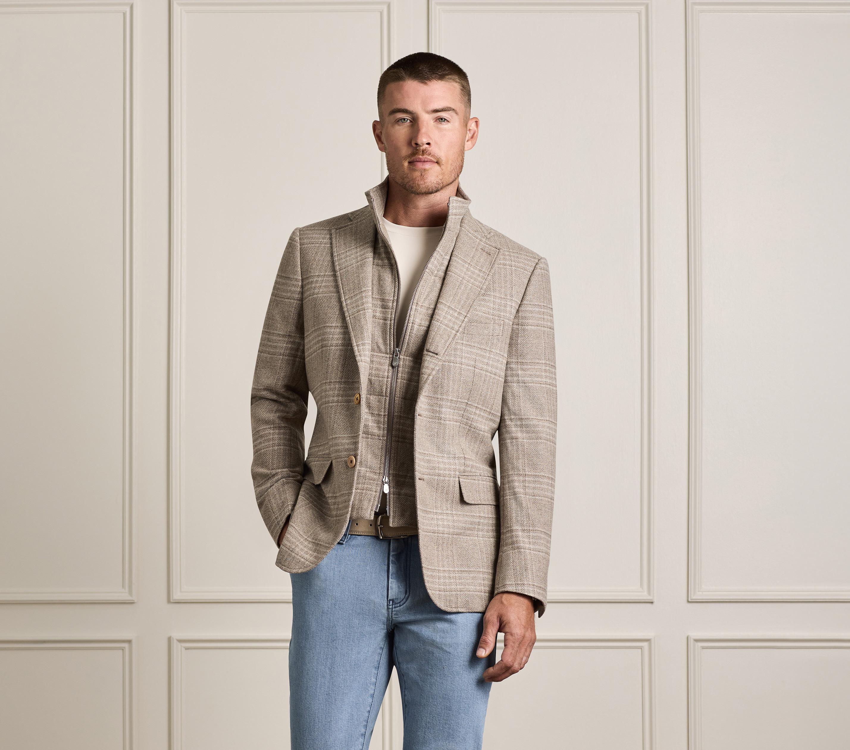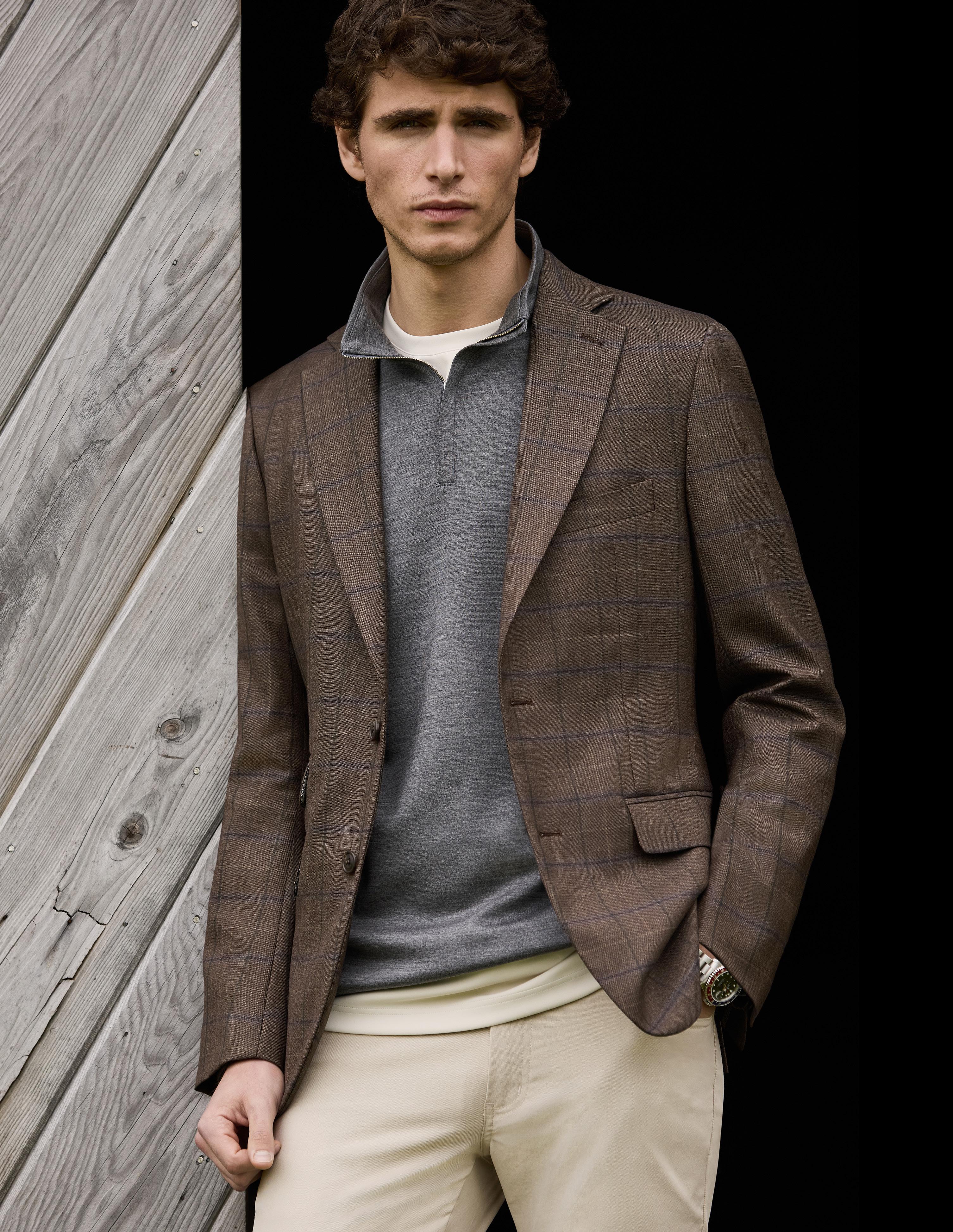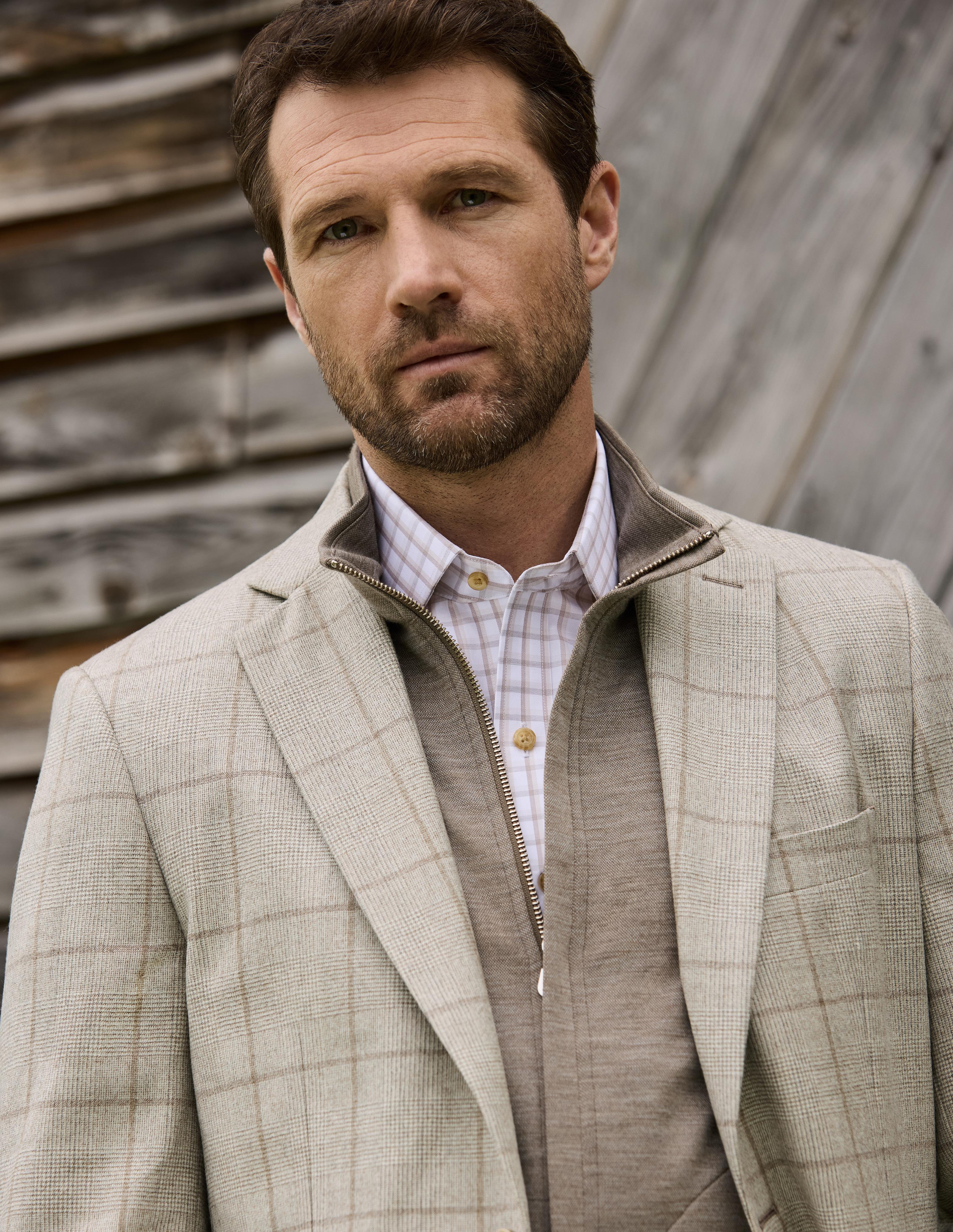 Our newly updated Windstopper sportcoat features a discreet button-inand-out design that allows you to easily add or remove a coordinating vest or hoodie insert for increased versatility and sophistication. Shown above in Taupe and Natural Trofeo Cashmere Plaid from Lanificio Ermenegildo Zegna.