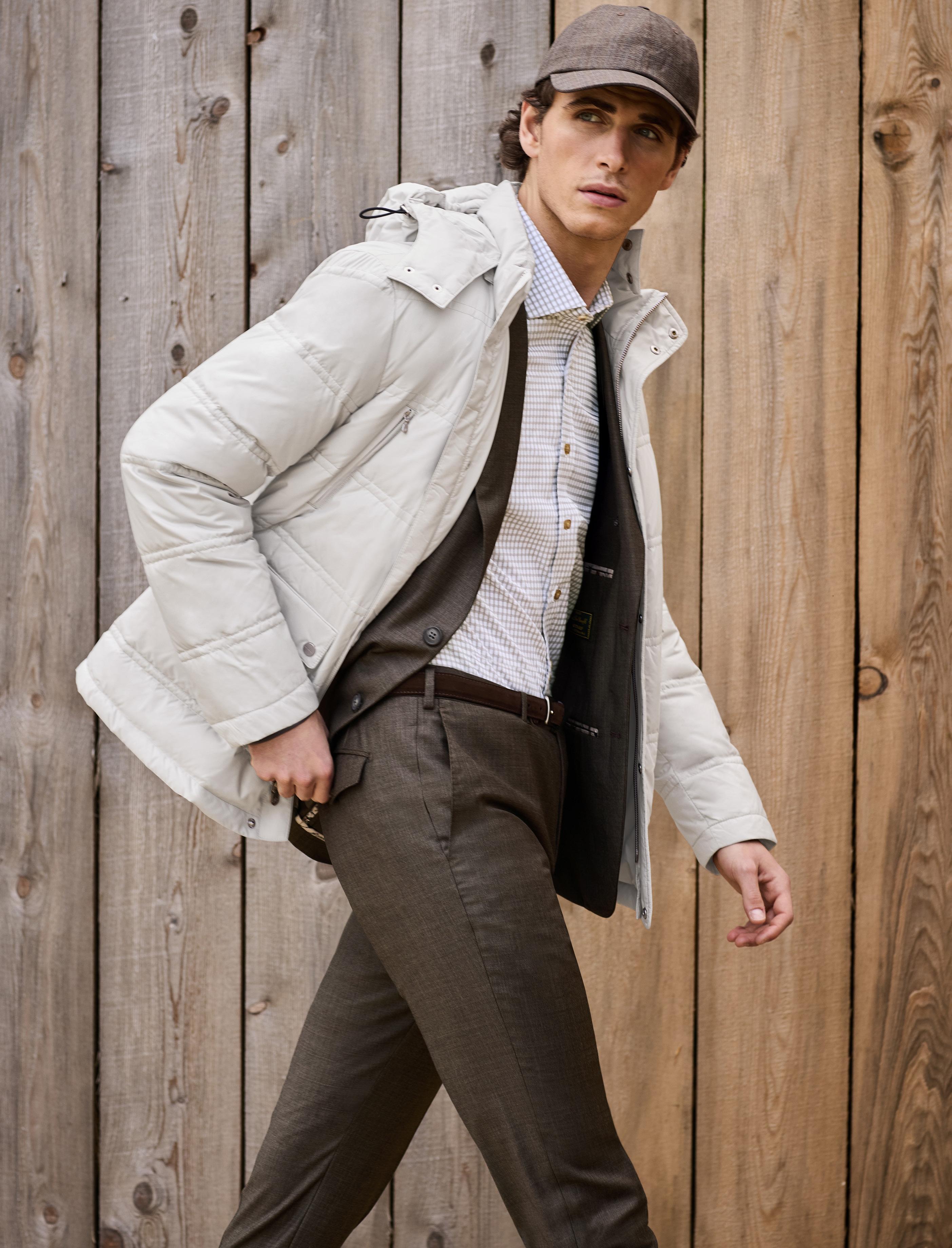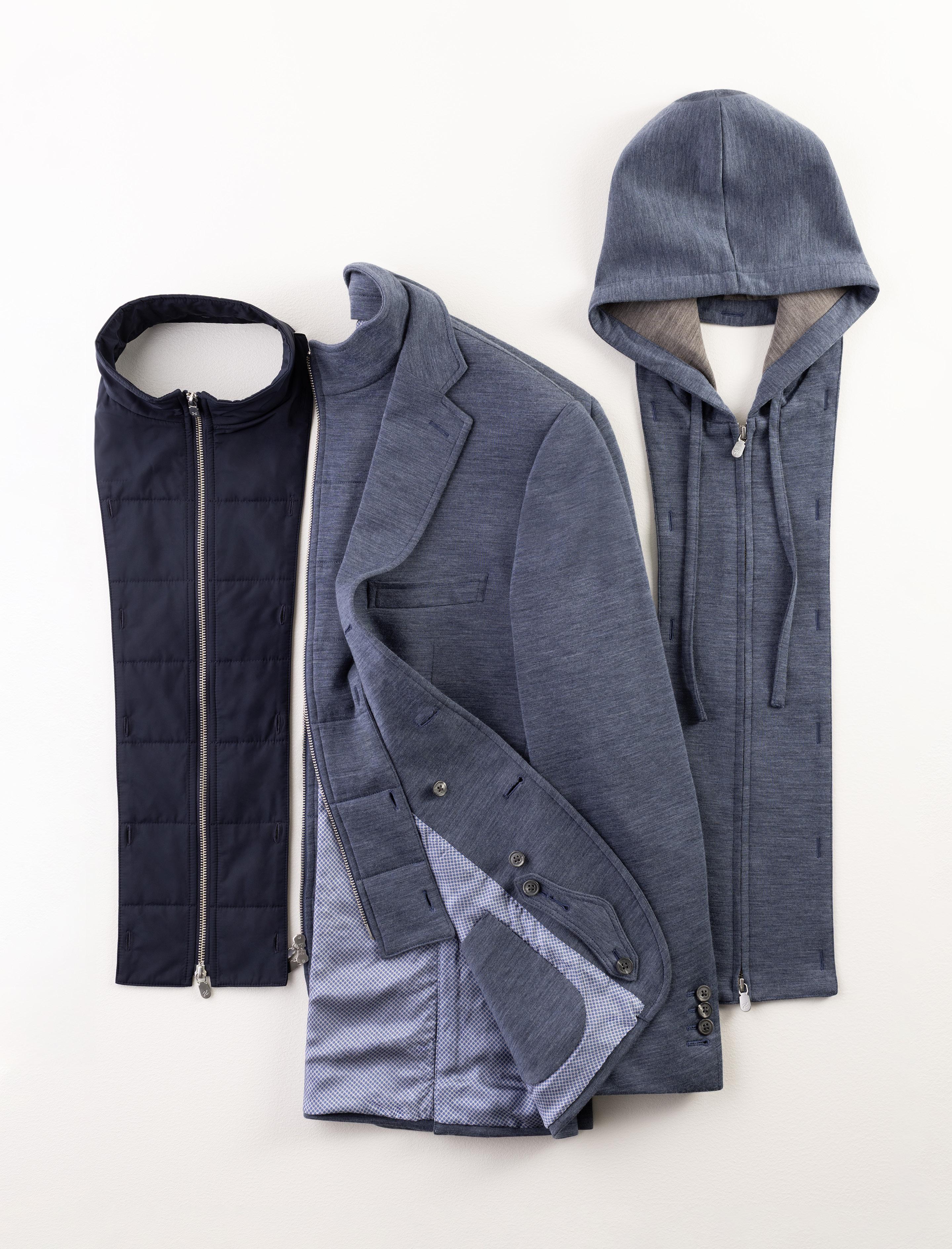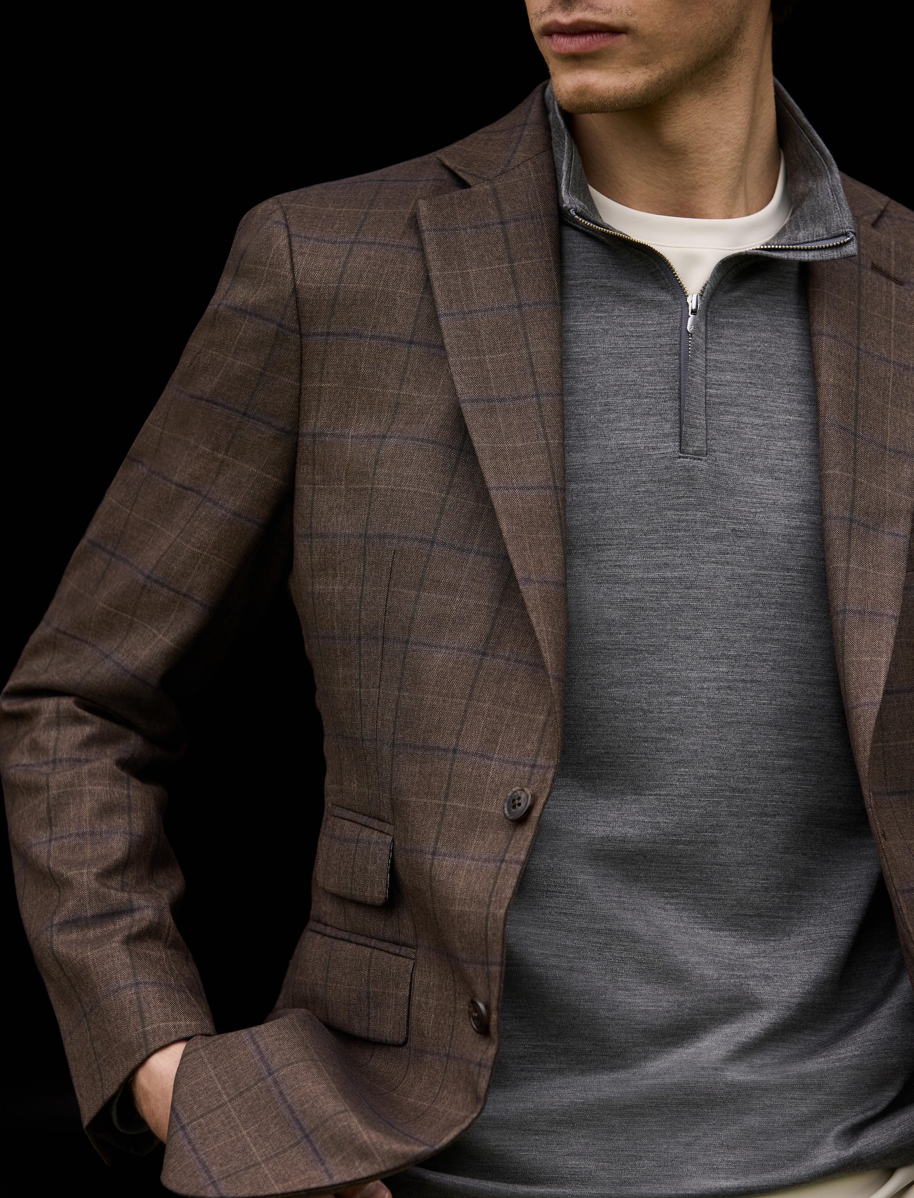 Our newly updated Windstopper sportcoat features a discreet button-inand-out design that allows you to easily add or remove a coordinating vest or hoodie insert for increased versatility and sophistication. Shown above in Taupe and Natural Trofeo Cashmere Plaid from Lanificio Ermenegildo Zegna.