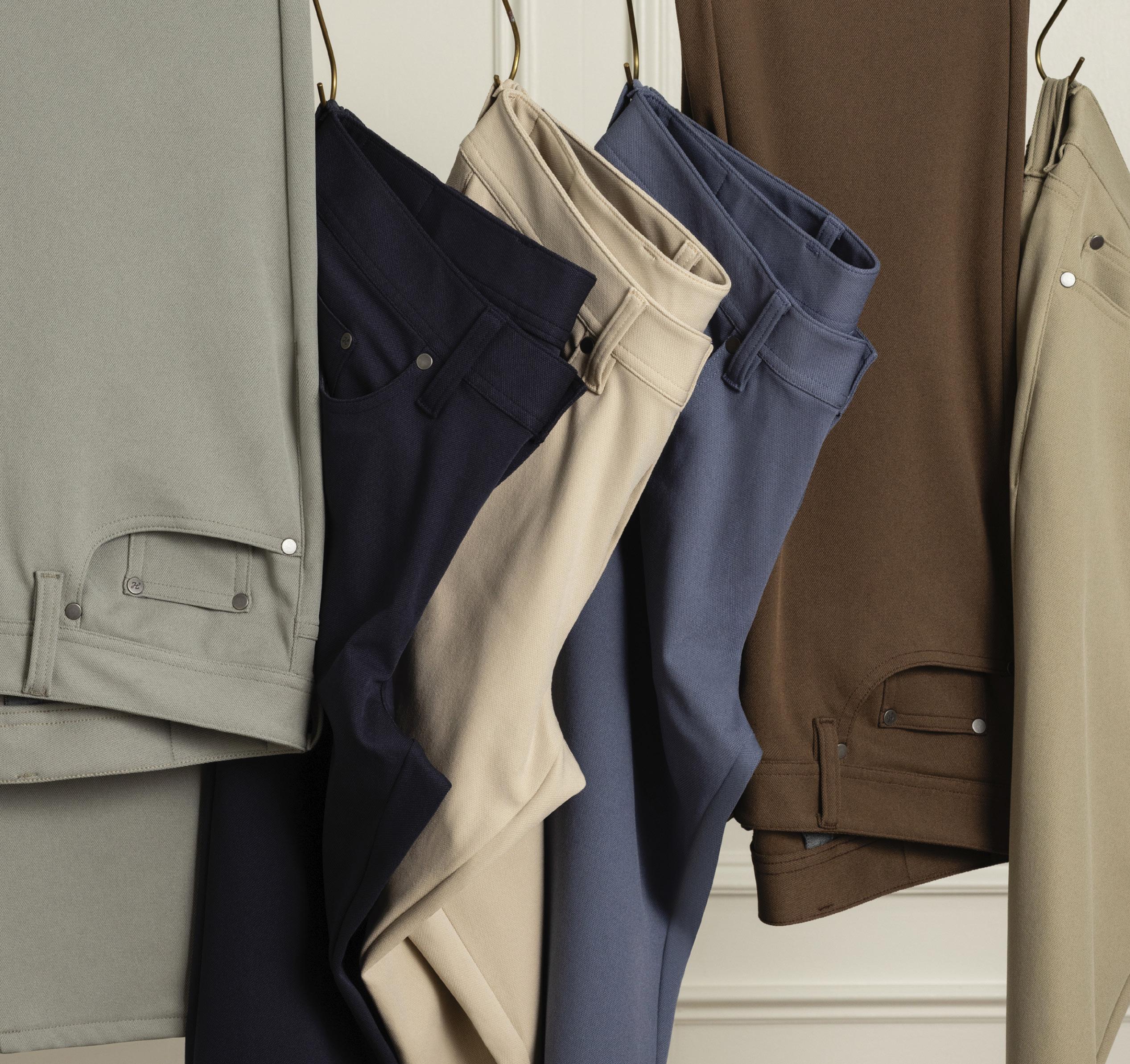 Our Textured 4-Way Stretch pant gives you the comfort and style that every man needs in his wardrobe. Shown above in Moondust, Night, Birch, Steel Grey, Nutmeg, and Cane.