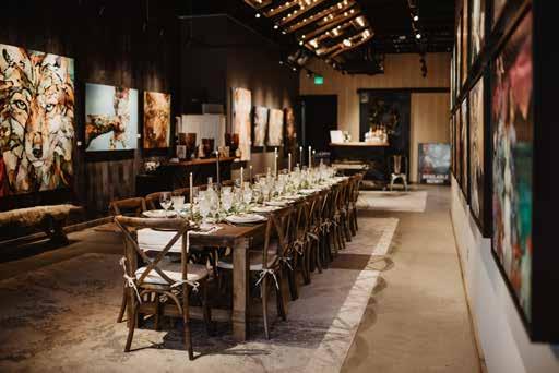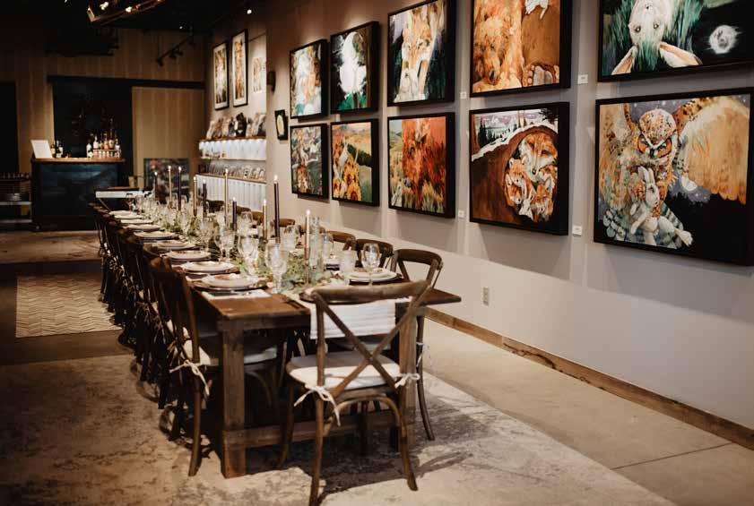 A ceremony at a location as beautiful as the Wedding Tree deserves a reception that feels equally intimate. So, if the Wedding Tree belongs in Lord of the Rings, DUSK at Ringholz Studios could grace the pages of The Great Gatsby. This art-studio-meets-event-venue is the creation of local wildlife mixed-media artist Amy Ringholz and resembles a speakeasy with its brick walls, colorful paintings, and long banquet tables. The small size of the space allows Ringholz to execute her craft by working with couples to design unique tablescapes and custom bars that showcase their personal style.