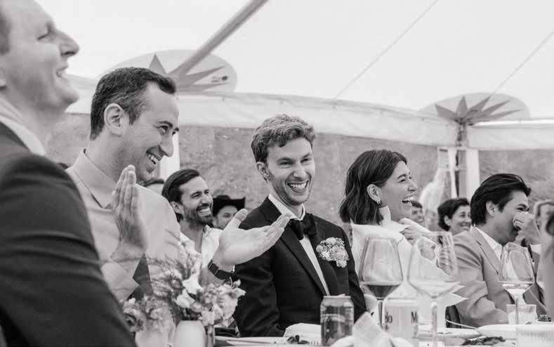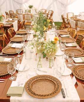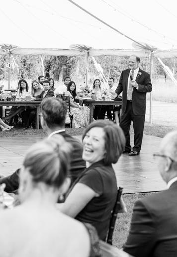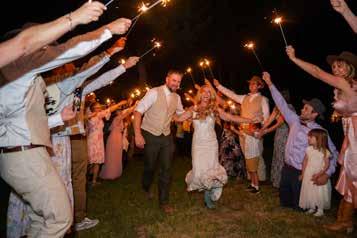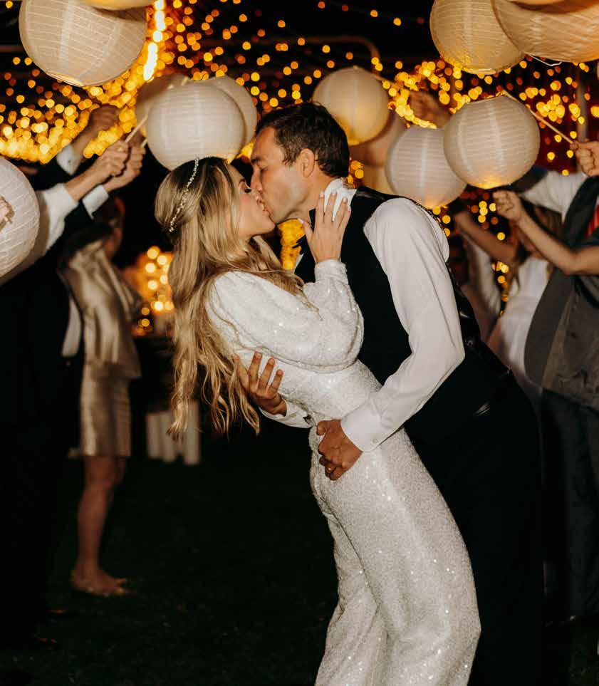 friends, and family, brought a sense of whimsy and love. Guests mingled around a bar-cart cantina as the warm glow of twinkling lights overhead set the scene. Those lights — a feat of engineering and teamwork by Andrew, our brothers, and friends — were strung 95 feet from the house to 12-foot beams plumbed earlier in the week. Solar lights dotted the property and pathways, ready to guide everyone under the magic of the night sky.