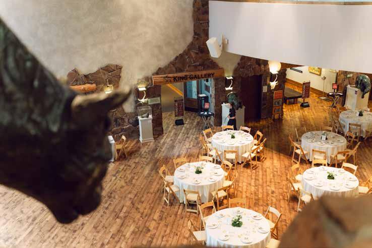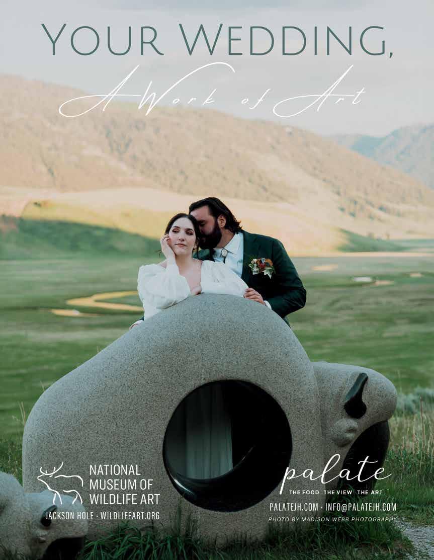 Weddings at the National Museum of Wildlife Art overlook the National Elk Refuge, with the Gros Ventre mountains and “Sleeping Indian” peak in the distance. This space often showcases the best sunrises and sunsets in the entire valley (especially on the hazy days of late summer and fall). Plan a dusk wedding when your silhouettes will be highlighted by blues, purples, and pinks, followed by a cocktail hour at the museum’s builtin restaurant, Palate.