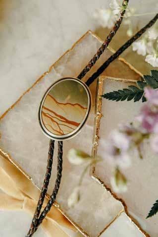 says Ashley Deighton, manager of MADE in downtown Jackson. MADE carries bolo ties crafted of leather, sterling silver, and turquoise from three different artists, which can be ordered ahead of time for wedding party adornment.