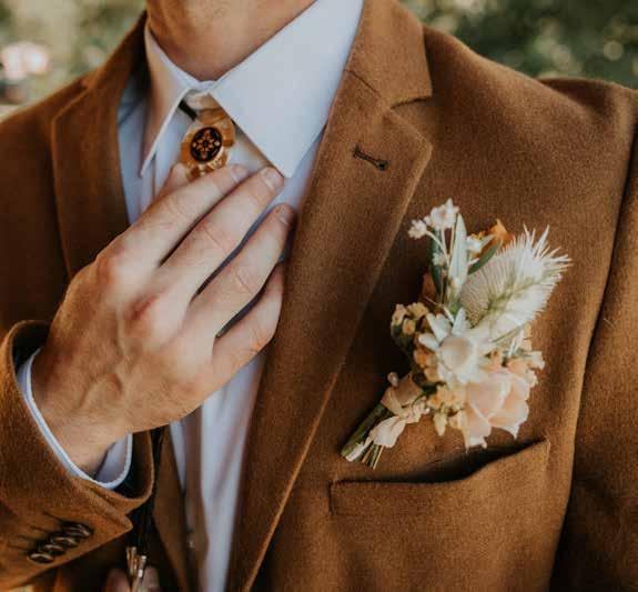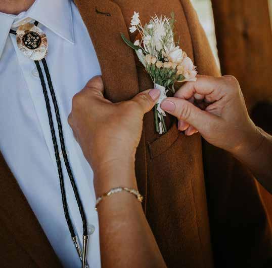 Bolo ties can be worn like any other necktie. Often seen paired with a collared shirt buttoned to the top, the tie can fit either securely at your neck, with the leather ties tucked inside the collar, or loosely for a more casual look (or when things start to heat up on the dance floor). You can choose to wear a sport coat with your tie, if the wedding is of the formal variety, or pair one with a denim shirt, if the invite calls for “Western casual.” Bolo ties with small clasps pair best with narrow-collared shirts, whereas large, ornate clasps look better with widecollared shirts. Above all, make sure your tie fits correctly and that the strings stop about three to four inches below your chest.