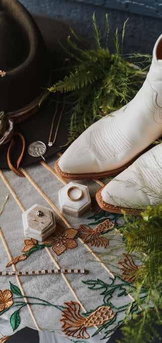 Kemo Sabe welcomes wedding parties to a private event space for a personalized bolo tie (and other Western wear) shopping experience. “Upstairs, we have a fully operational bar, and no merchandise purchases are required with the event space rental,” says Haley Sisitki, event manager at Kemo Sabe. “We host welcome parties so that people can get boots, bolo ties, and hats at the beginning of the weekend to wear to the wedding.” She explains that most of their wedding clients hold their celebration at local ranches and really dive into the Western theme. For instance, for a Moose Creek Ranch wedding, the store provided custom moose bolo ties for the groomsmen. Sisitki explains that they can make custom hats, belt buckles, and bolo ties, complete with an inscription of the wedding date or other adornments, but they need to know a few weeks ahead of time to send the order to their manufacturing “ranch.”
