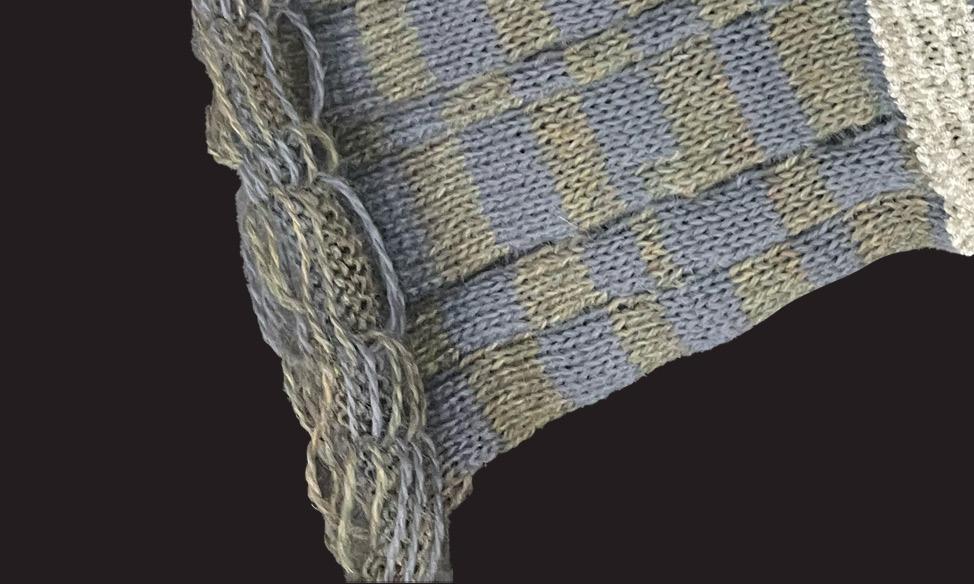 Therefore, I grabbed a few samples that I developed from the collection and knitted them with variations in materials, color combinations, and scale of the repeat. Eventually, the group of samples that I developed was used in this application sketch of a backpack that is fully reflective in the front, with a spacer fabric as the back support.