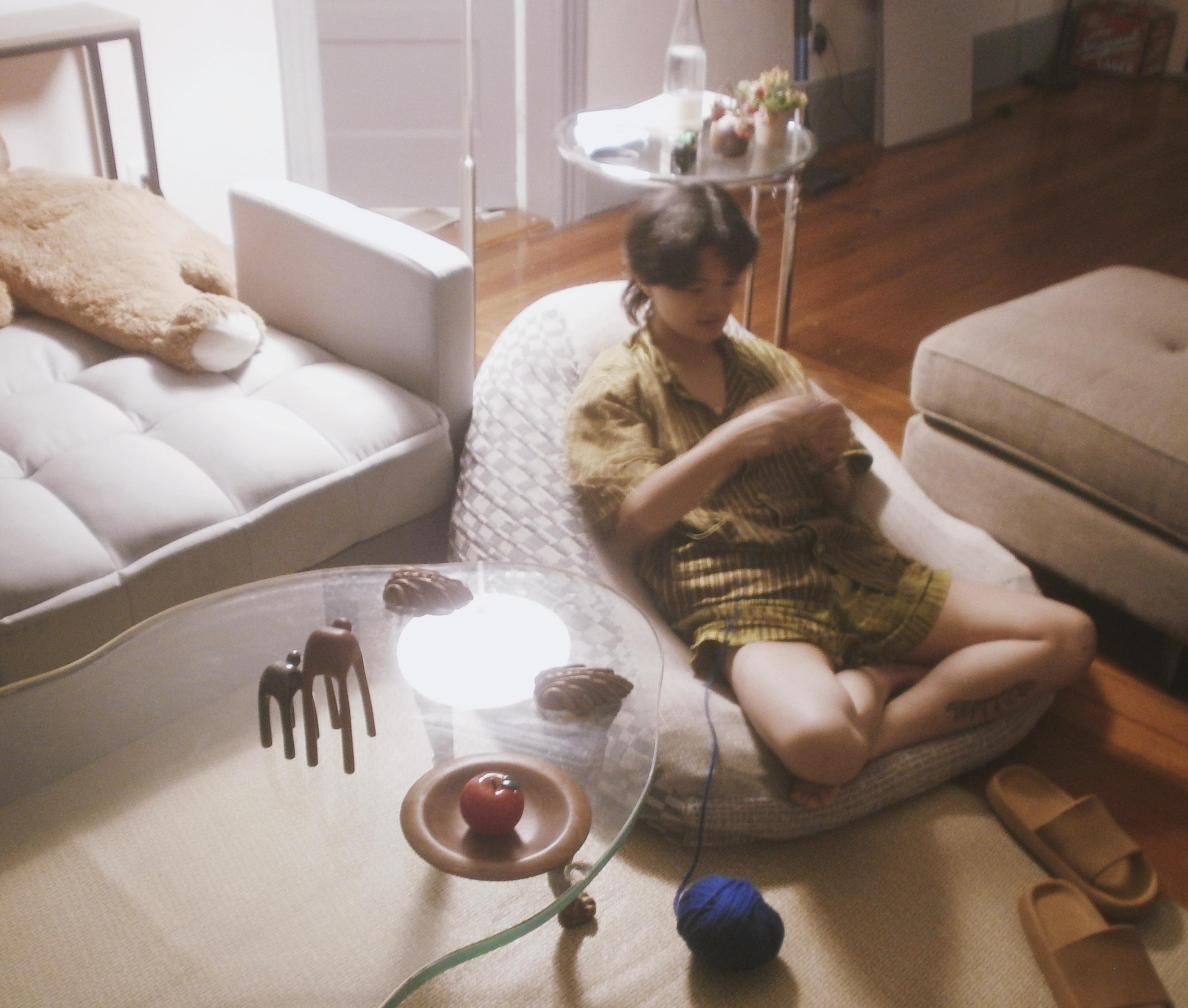 This bean bag is made out of single bed machine knitting fabrics. Punch cards, and tuck structure were used to achieve particular patterns. The material that were used are all soft and durable so that this bean bag is inviting and comfortable as a home soft good.