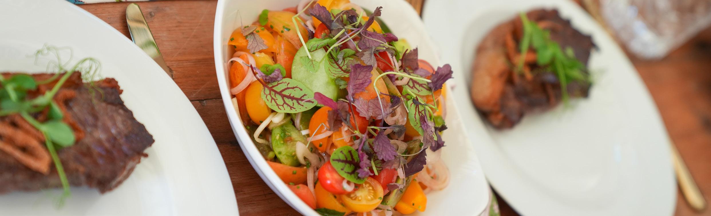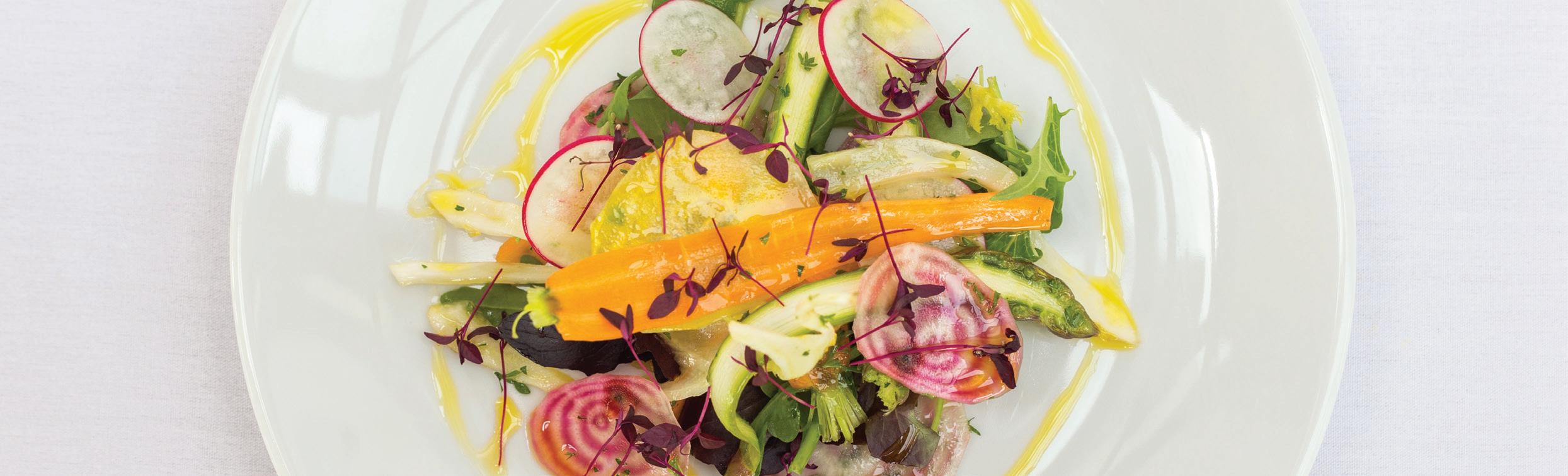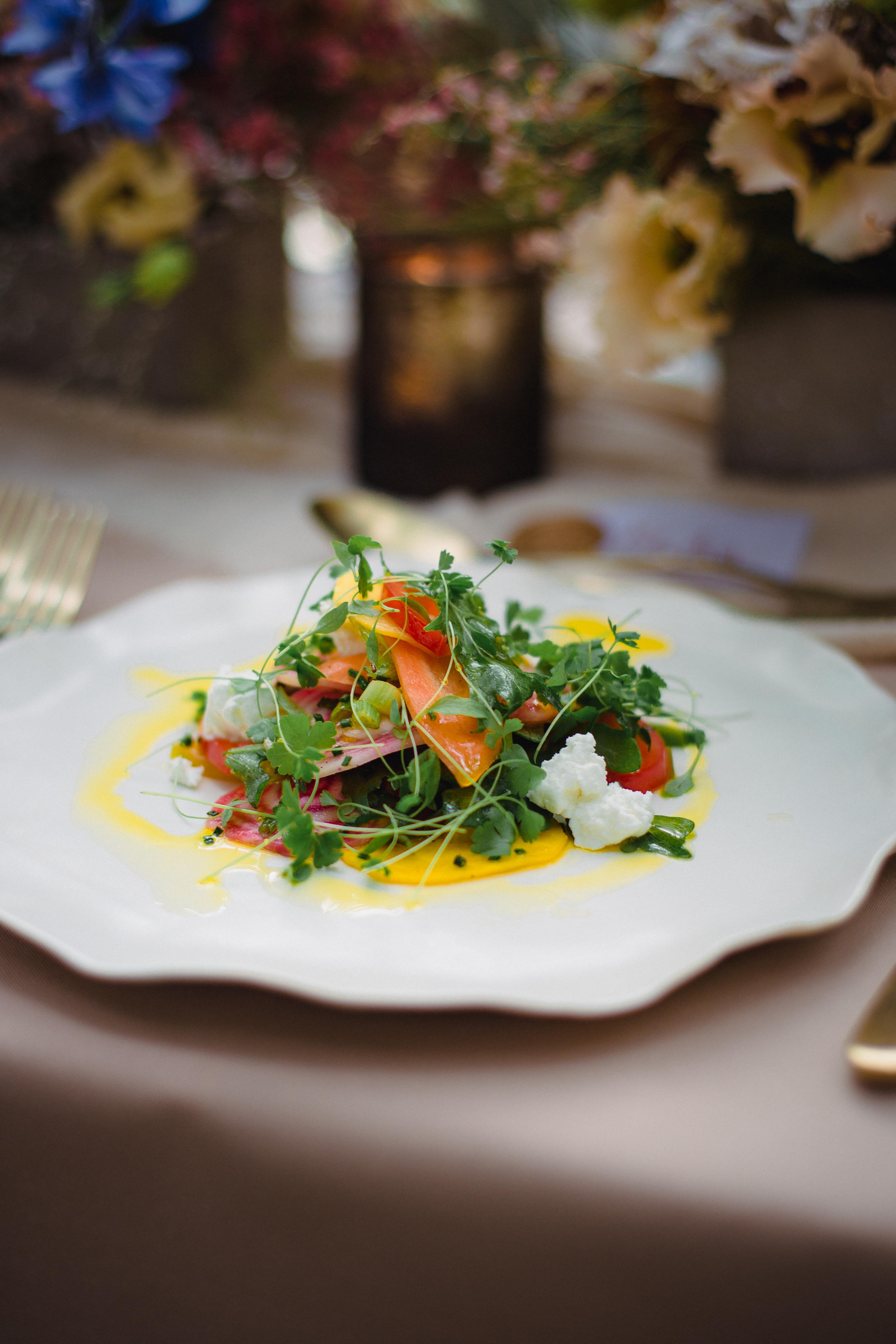 Citrus marinated summer vegetables with goat’s curd and mixed leaves