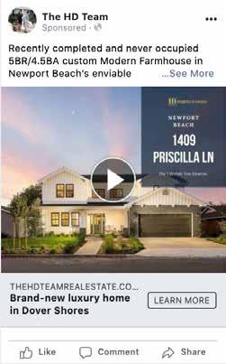 DIGITAL ADS ON SOCIAL MEDIA ONLINE MARKETING REPORT 1409 Priscilla Ln, Newport Beach, CA 92660 Listed By: Hoda Hajirnia and Drew D’Angelo Report Period: January 12 18, 2021 Top Performing Ad Headline: Brand-new luxury home in Dover Shores Body: Recently completed and never occupied 5B Priscilla_video Impressions Reach 8,367 8,367 Ad set: Priscilla Impressions The number of times your ads were shown 8,367 Impressions Ad: Priscilla_video