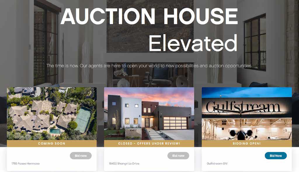 Welcome to Agent Auction, the premiere luxur y plat form dedicated to optimizing the buying and selling experience of upmarket real estate proper ties and high-end products with immediate results Agent Auction utilizes our global brand reach, major national television network circulation, targeted digital campaigns, and exper t photography and literature to ensure each proper t y, object, and item gains maximum exposure across each respective industr y, worldwide Our abilit y to separate ourselves as a distinctive upmarket auction site attracts an expansive assemblage of serious domestic and international prospective buyers with offers in hand, prepared to strike a deal from any where across the globe