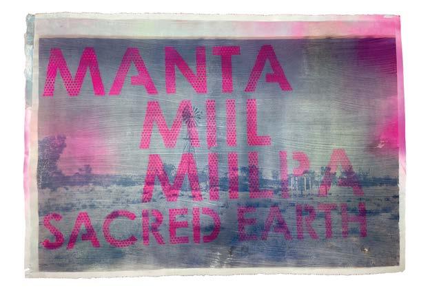 Manta Miil-miilpa (2022) is a collection of photograms in which Fielding records the interplay between language and landscape. A dance between artist and Country, the paper accumulates marks and an aura of colour that evokes the eternal presence of Tjukurpa and his ancestors’ spirits. On top of these ephemeral frottages, Fielding photographs the landscape using a UV sensitive dye to expose the image onto the paper, and the traces of variable natural elements are recorded. To finish the works, the exposures are washed in the water of the land and left to dry.
