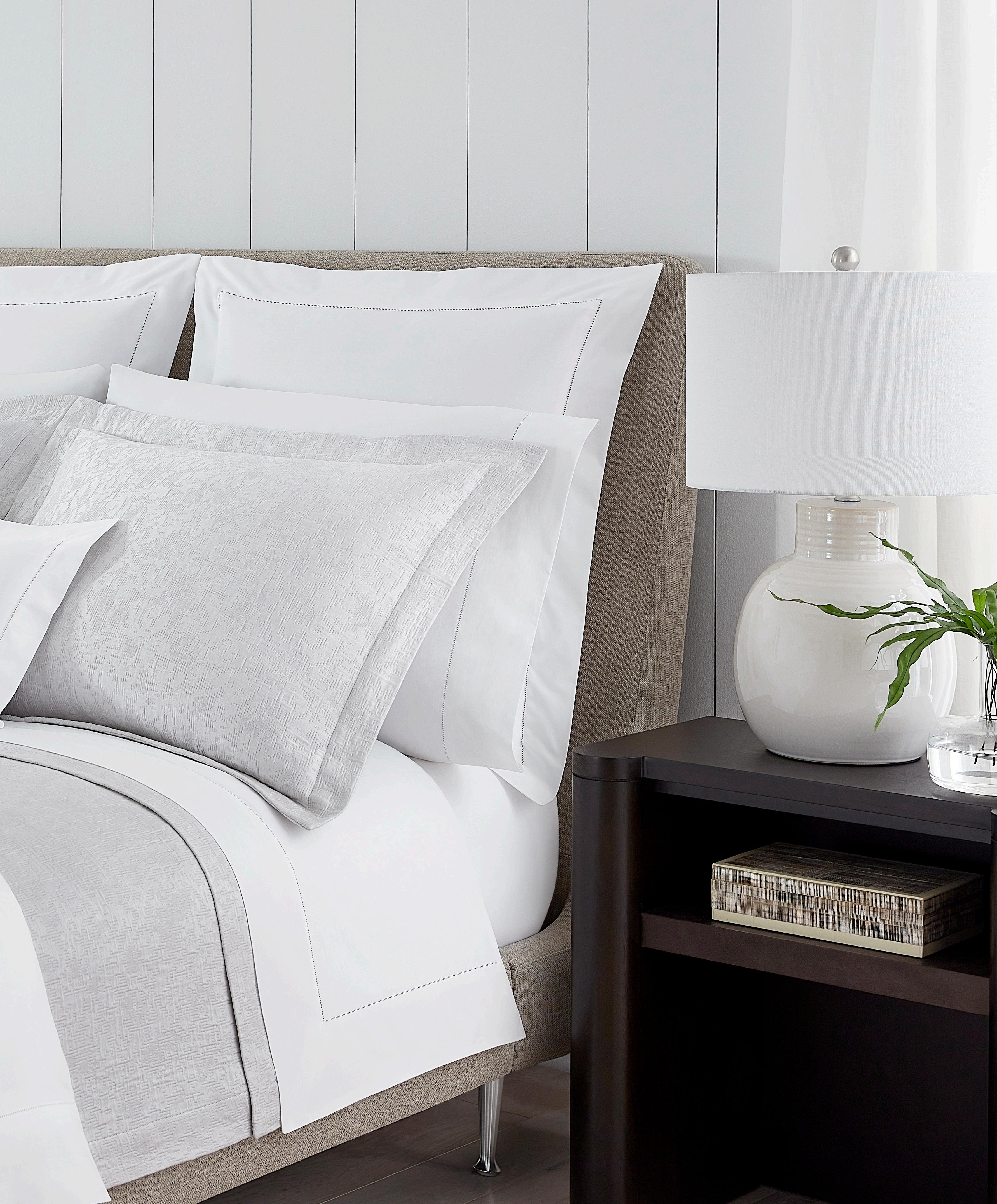 For us, it all starts with the raw material and the quality level of cotton that goes into the spinning and weaving of our beautiful percale and sateen fabrics. Quality raw material, as a first step, is very important to the final outcome for hand and sleep experience on a SFERRA sheet. We do not apply any finishes to our fabrics. The soft hand comes from the chosen cotton. We then use natural processes to break in and open up the cotton yarns which adds even more softness to the fabric. This means your sheet will feel the same before and after washing as there is nothing to wash off during the laundering cycle. The fabric can then be embellished with a simple hemstitch, embroidery, and beyond.
