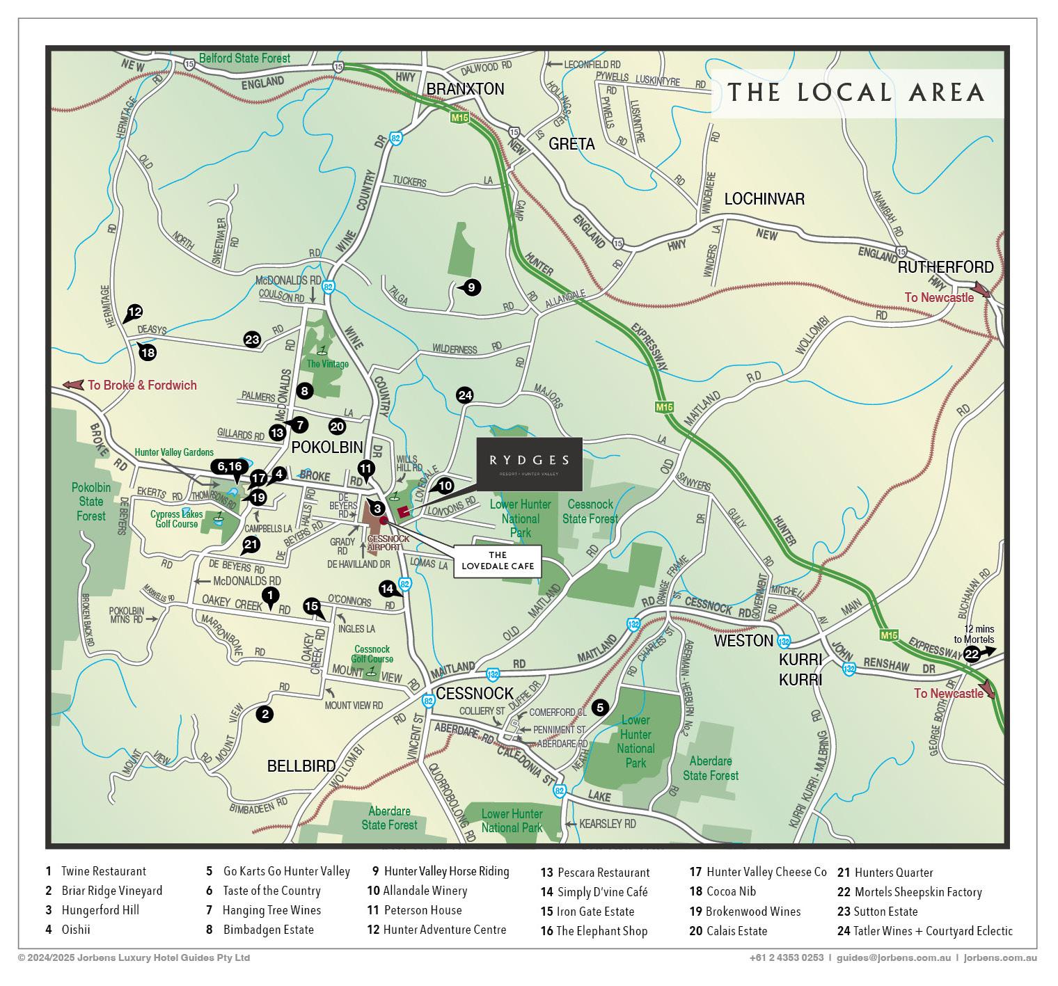 © 2023/2024 Jorbens Luxury Hotel Guides Pty Ltd 15 15 15 82 82 132 M15 C R E E K LDS R MREH TI A G E RD HERM I TAGE RD OLD NORTH RD RD C A M P R TUCKERS LA RD DALWOOD RD DEASYS COU PALMER GILLARDS RD D E B E Y E R S R D RD THOM PSONSRD RS RD MOUNT V IEW RD BIMBADEEN RD MOUNT VIEW RD DUFFIE INGLES LA EKERTS RD MOUNT VIEW RD CAMPBELLS RD RD COLLIERY ST SWEE T WAT E R R D H WOLLOMBI RD EK RD R D O A K E Y MOUNT VIEW RD QUORROBOLONG RD V I N C E N T S T OLD McDONALDS RD ABERNATHY NEW ENGLAND HWY NEW MAITLAND RD B R OKE RD CALEDON ABERDARE RD E COUNTRY DR Hunter Valley Gardens To Broke & Fordwich L owe r Hu N a ti o n Pa r k L owe r Hu n N a ti o n a l P B e l fo r d S t a te Fo re s t Po ko lb in S t a te Fo re s t A b e rd a re S t a te Fo re s t Cypress Lakes Golf Course Cessnock Golf Course BR ANX TON BELLBIRD CESSNOCK KITCHENER 21 18 6, 16 1 2 15 12 19 1 7 2 3 1 Twine Restaurant 2 Petersons Wines Mount View 3 Petersons Wine Pokolbin 4 Baume 5 Polkolbin Cider House 6 Savannah Estate 7 Pepper Tree Wines 8 Hungerford Hill 9 Oishii 10 Go Karts Go Hunter Valley 11 Taste of the Country 12 Watershed Gallery 13 Bimbadgen Estate 14 Hunter Valley Horse Riding THE LOVEDALE CAFE