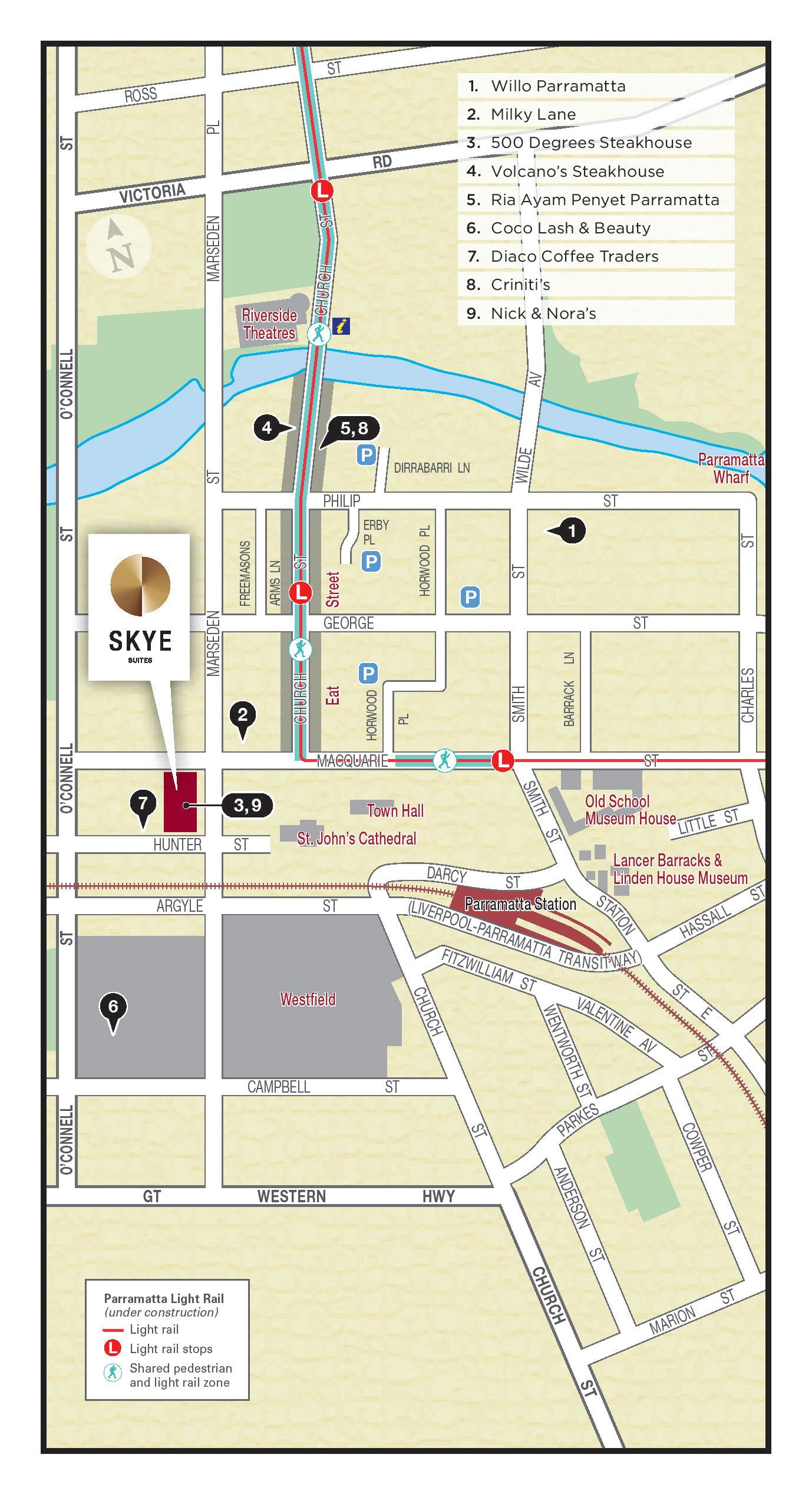 L MACQUARIE ST C H U R C C H A R L C SMITH ST STAT I ON S M I T H HUNTER ST ADA KENDAL RSON ST ST LITTLE ST CHURCH ST O ’ C O N N E L L 7 2 3 , 9 Old School Museum House Town Hall St. John’s Cathedral Eat Street HORWOOD BARRACK LN PL Light rail Light rail stops Shared pedestrian and light rail zone L Parramatta Light Rail (under construction) Open 11.45am–late every night with Happy Hour every day 4pm–6pm Feel like Milky Lane now? Scan the QR Code, enter your room number and we will drop your Milky Treats to Reception. 20/22 Macquarie St, Parramatta 02 9689 3893 | milkylane.co Parramatta’s Favourite Burgers, Cocktails & Desserts Order Online