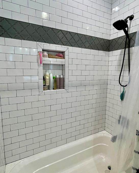 ABOVE RIGHT: The third bedroom’s en suite bathroom includes subway tile, a tub, and black tile accents.