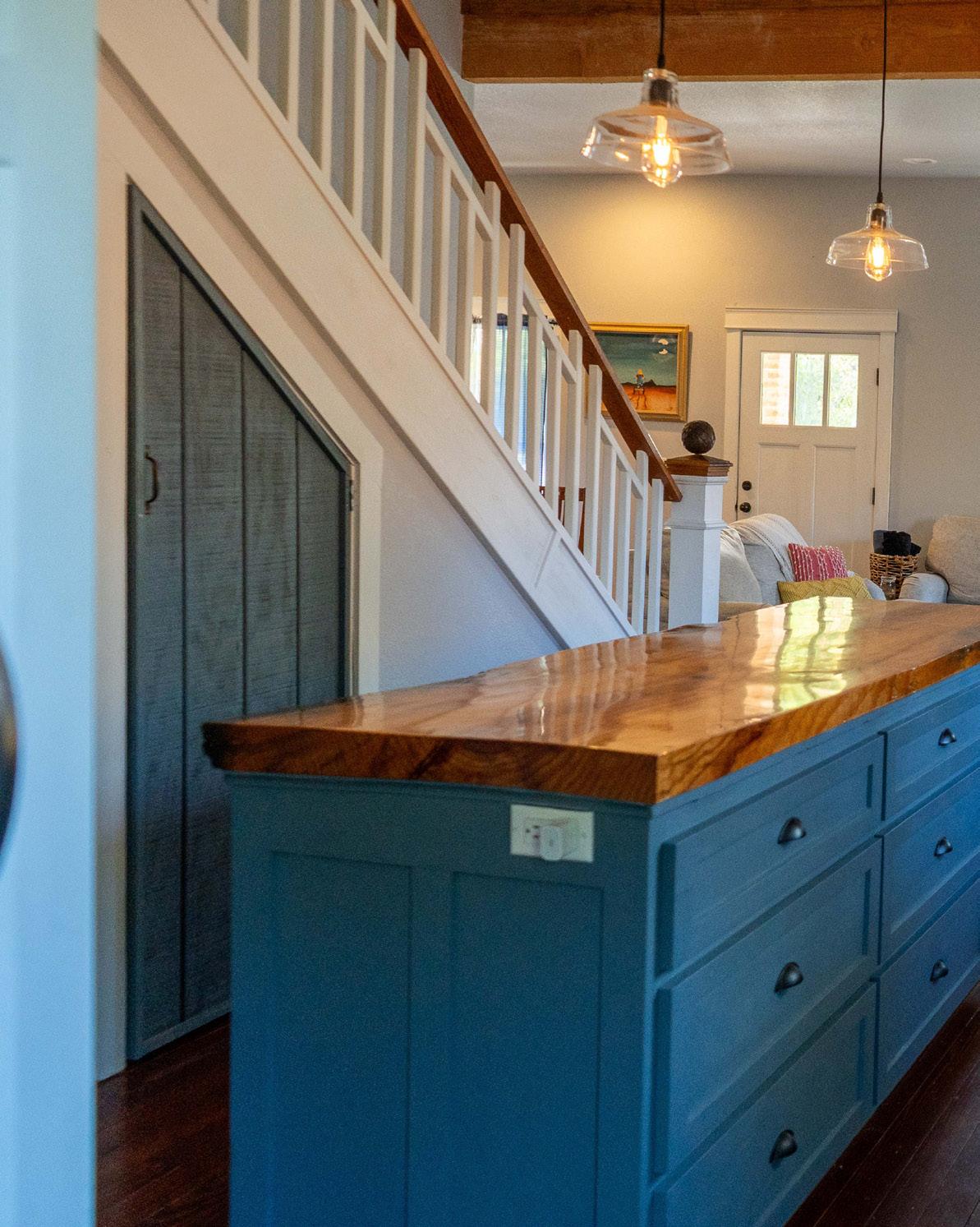 Evelyn Gulley had the kitchen island countertop made from a single tree, she kept the bark to provide a rough edge.