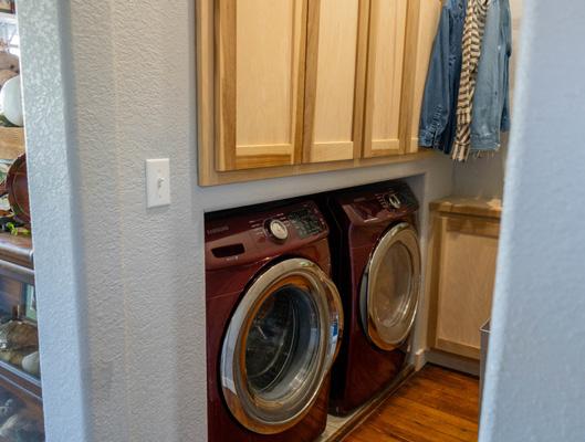 The laundry room features a sink and plenty of cabinets done in a bright, cheery color.