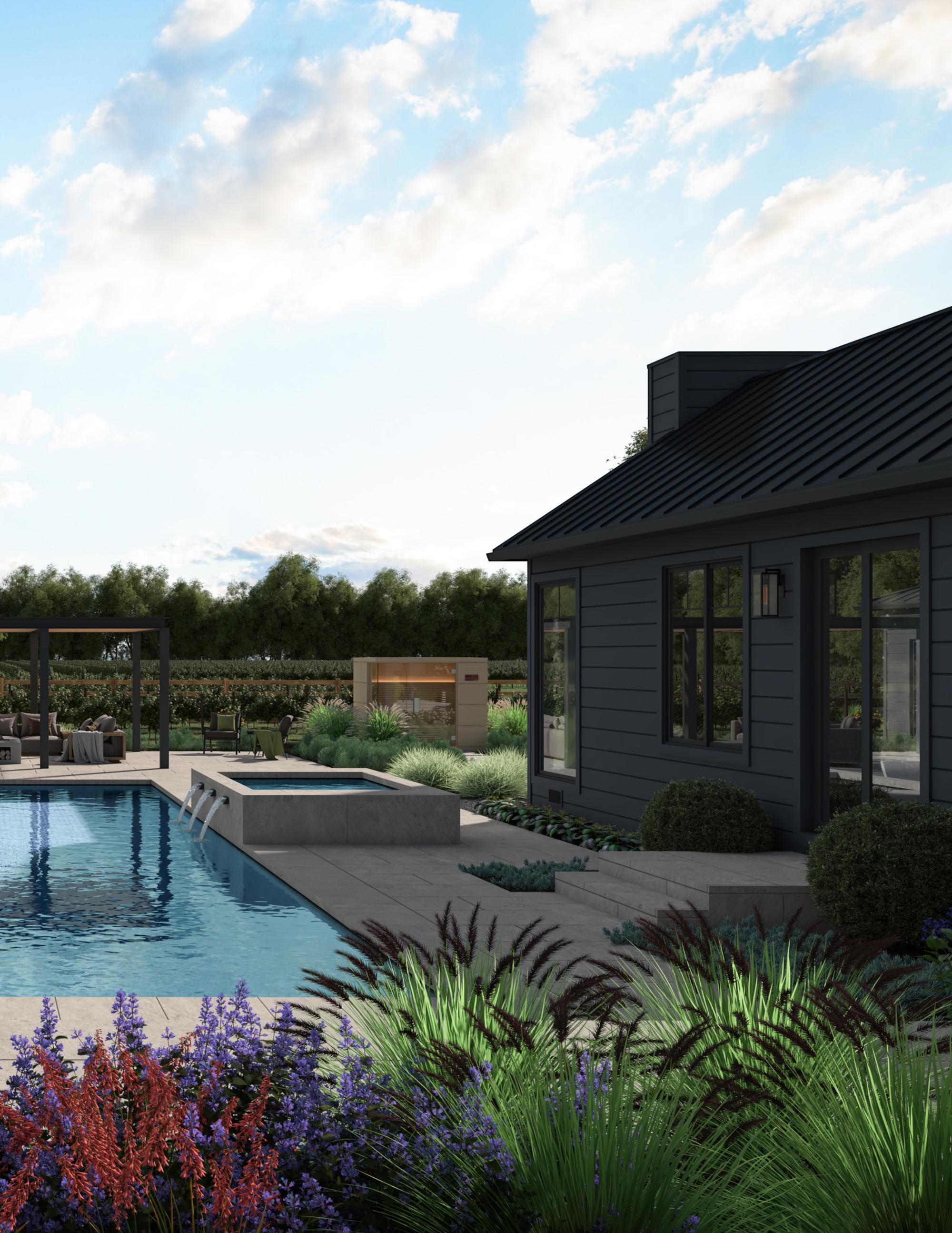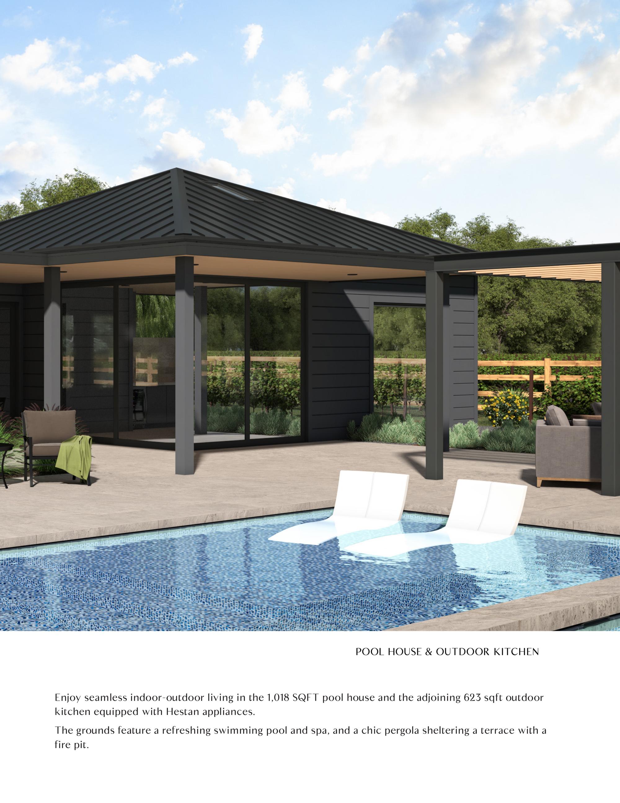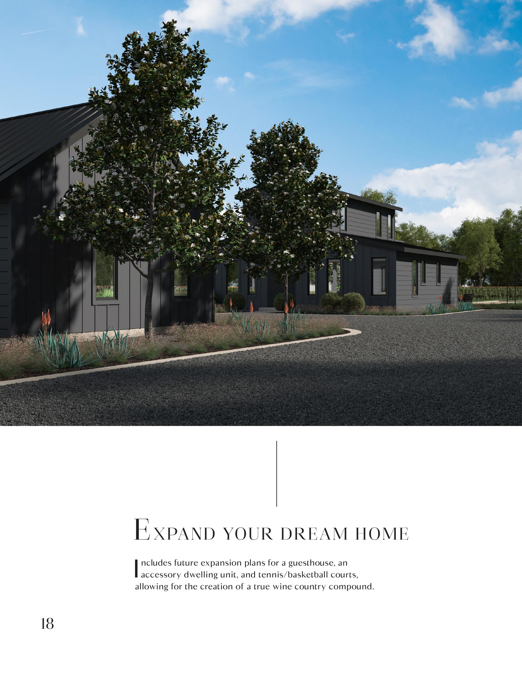 On 3.39 gated acres this sophisticated new five-bedroom home—combines the charm of farmhouse style with the clean lines of contemporary architecture and will offer all the comforts and conveniences of resort-caliber living. The 5,458-square-foot floor plan is configured to surround an alluring courtyard, with three bedrooms in the main wing of the home and two in a private guest wing. Highlights will include a living room with a DaVinci Maestro fireplace, a family or media room with a wet bar and its own fireplace, an 860-bottle temperature-controlled wine room, an office, and a kitchen with an island and countertops of Calacatta marble; white oak cabinets; and Sub-Zero, Wolf, and Miele appliances. Entertainers will appreciate the butler’s pantry and auxiliary kitchen, which provides ample storage and Wolf appliances. Three of the bedrooms—including the owner’s suite. Plans for ADU and Guest House. Seven bedroom septic.