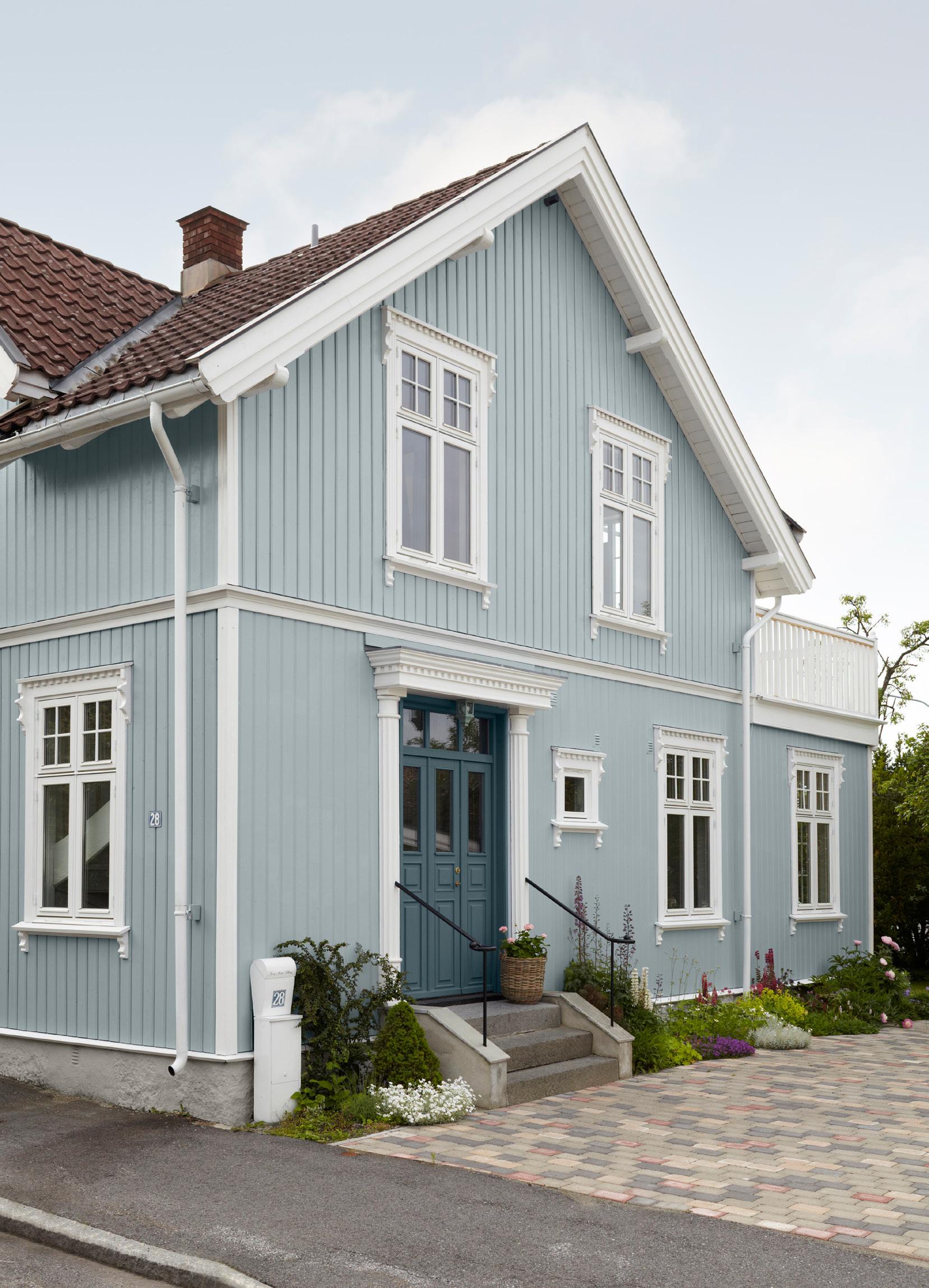 Dämpade blåtoner, som varken är för ljusa eller för mörka, ger huset en särprägel och identitet utan att bli för intensivt. Vitmålade detaljer lyfter helhetsintrycket när det kommer till klassisk arkitektur.