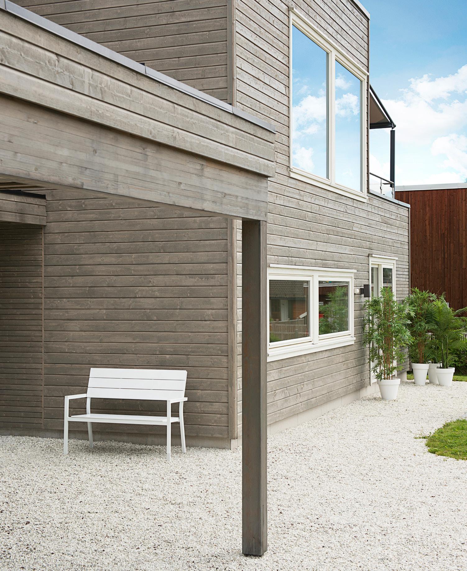 VÄGG OCH PERGOLA: TREBITT 90033 FUNKISSVART BÄNK OCH TERRASS: JOTUN 90029 NATURLIGT SILVERGRÅ MURVÄGG: JOTUN 1402 CANVAS