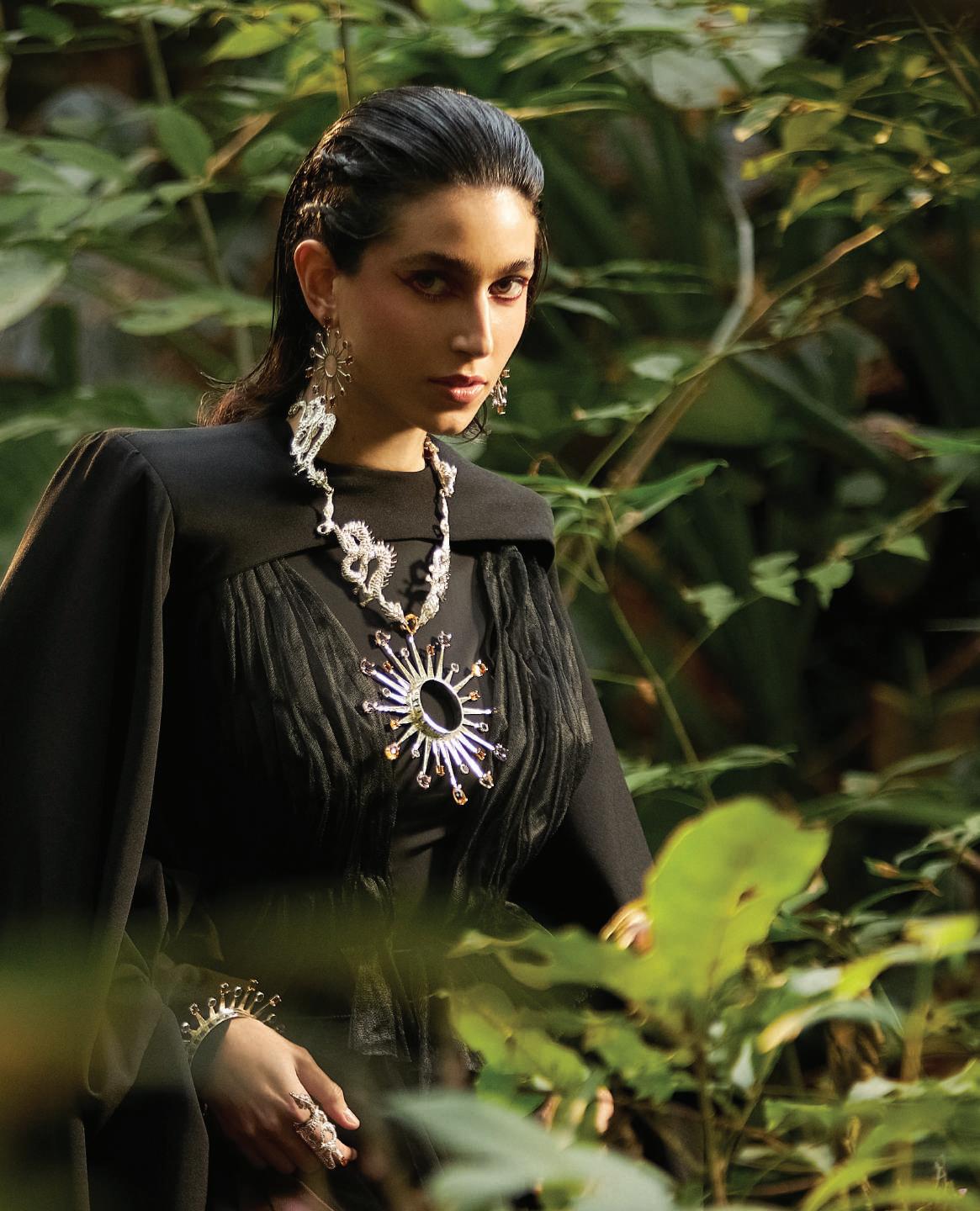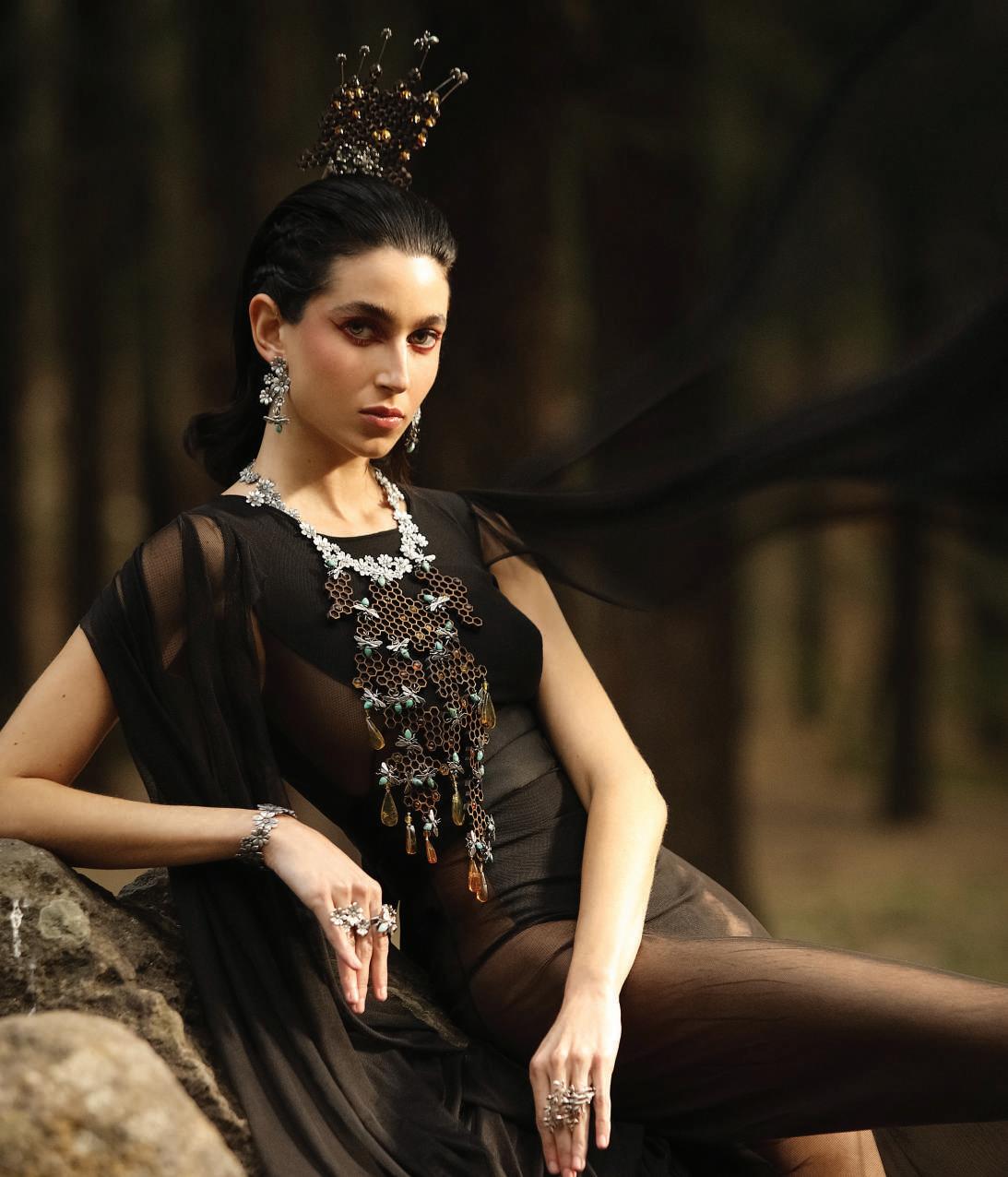 “Teníamos como inspiración el bosque, y nos centramos en crear piezas que se vieran, que tuvieran ese toque bien cuidado de medias, guantes, cinturones, bustiers para resaltar aún más los collares; que fueran ninfas femeninas con texturas de apariencia de seda; todo esto a un tono propositivo, para crear un complemento que realzara la magia de lo diseñado por los joyeros”.