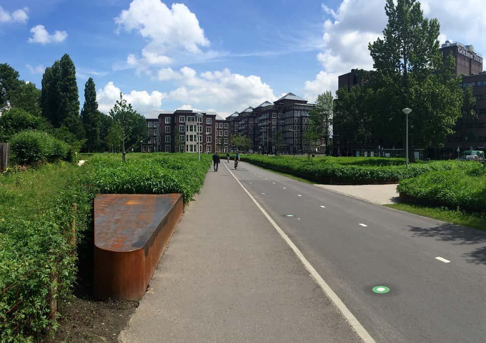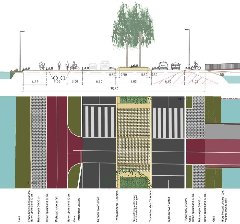 As can be seen from the map and legend, the choice of materials and plants for the restructuring has been strongly inspired by the Westerpark. As a cyclist, you cycle through the greenery, and as a walker or person catching a tram you can even count the rabbits as you briefly sit down on one of the continuous wooden benches.