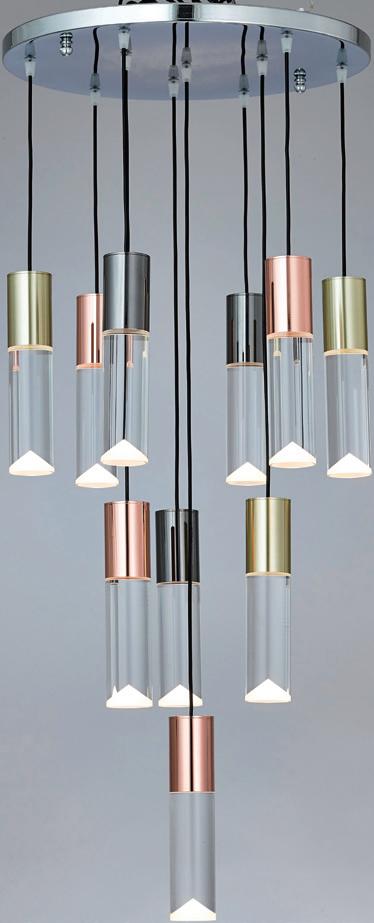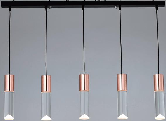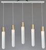 This five-light pendant creates a striking rhythm with sleek cylindrical shades, blending warm metallic tones with clear geometry—ideal for dining areas, kitchen islands, or modern interiors.