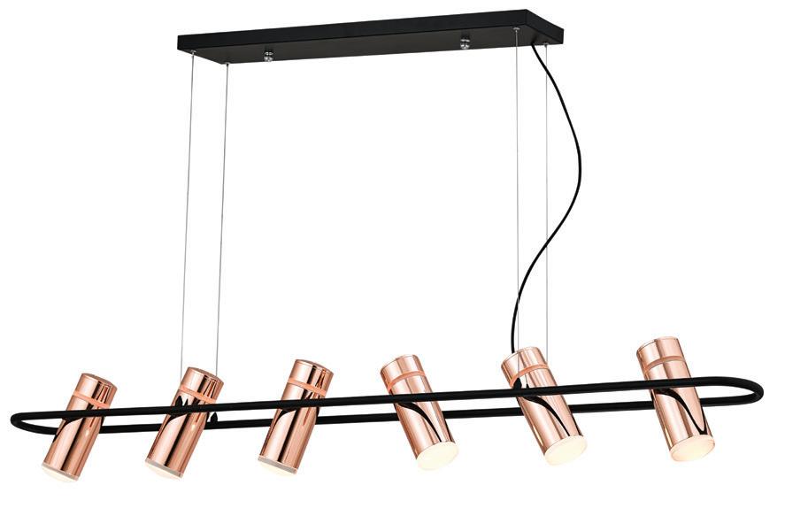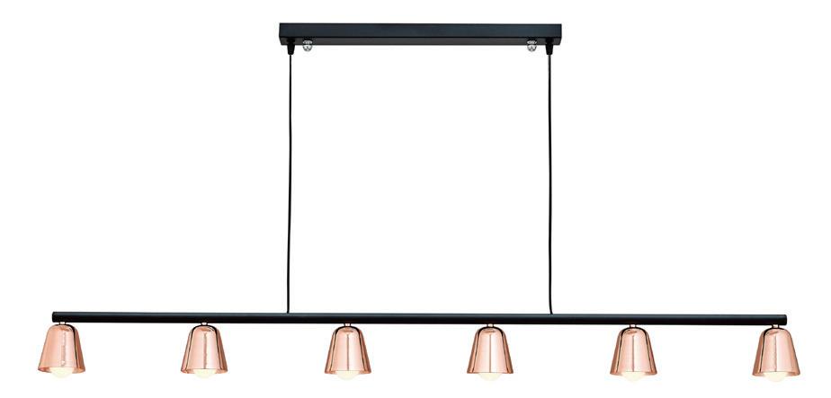 A statement chandelier with bold cylindrical forms in black and copper. Its striking composition of multiple lights creates a dramatic centerpiece, blending modern sophistication with a warm, ambient glow.
