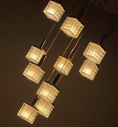 A cascade of crystal cubes suspended in perfect harmony. This modern chandelier blends geometric elegance with warm illumination, creating a striking focal point for any contemporary interior.